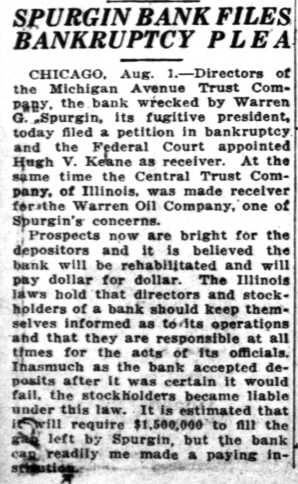 SPURGIN BANK FILES BANKRUPTCY PLEA CHICAGO, Aug. 1.-Directors of the Michigan Avenue Trust Company, the bank wrecked by Warren G. Spurgin, its fugitive president, today filed a petition in bankruptcy and the Federal Court appointed Hugh V. Keane as receiver. At the same time the Central Trust Company, of Illinois, was made receiver for the Warren Oil Company, one of Spurgin's concerns. Prospects now are bright for the depositors and it is believed the bank will be rehabilitated and will pay dollar for dollar. The Illinois laws hold that directors and stockholders of a bank should keep them. selves informed as to its operations and that they are responsible at all times for the acts of its officials. Inasmuch as the bank accepted deposits after it was certain it would fail, the stockholders became liable under this law. It is estimated that Swill require $1,500,000 to fill the left by Spurgin, but the bank can readily me made a paying instiuution R
