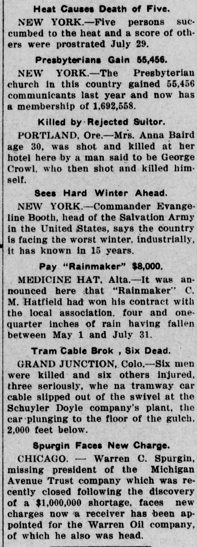 Heat Causes Death of Five. NEW YORK.-Five persons succumbed to the heat and a score of others were prostrated July 29. Presbyterians Gain 55,456. NEW YORK.-The Presbyterian church in this country gained 55,456 communicants last year and now has a membership of 1,692,558. Killed by Rejected Suitor. PORTLAND, Ore.-Mrs. Anna Baird age 30, was shot and killed at her hotel here by a man said to be George Crowl. who then shot and killed him. self. Sees Hard Winter Ahead. NEW YORK.-Commander Evangeline Booth, head of the Salvation Army in the United States, says the country is facing the worst winter, industrially, it has known in 15 years. Pay "Rainmaker" $8,000. MEDICINE HAT, Alta.-It was announced here that "Rainmaker" C. M. Hatfield had won his contract with the local association. four and onequarter inches of rain having fallen between May 1 and July 31. Tram Cable Brok , , Six Dead. GRAND JUNCTION, Colo.-Six men were killed and six others injured, three seriously, whe na tramway car cable slipped out of the swivel at the Schuyler Doyle company's plant, the car plunging to the floor of the gulch. 2,000 feet below. Spurgin Faces New Charge. CHICAGO. - Warren C. Spurgin, missing president of the Michigan Avenue Trust company which was recently closed following the discovery of a $1,000,000 shortage, faces new charges now a receiver has been appointed for the Warren Oil company, of which he also was head.