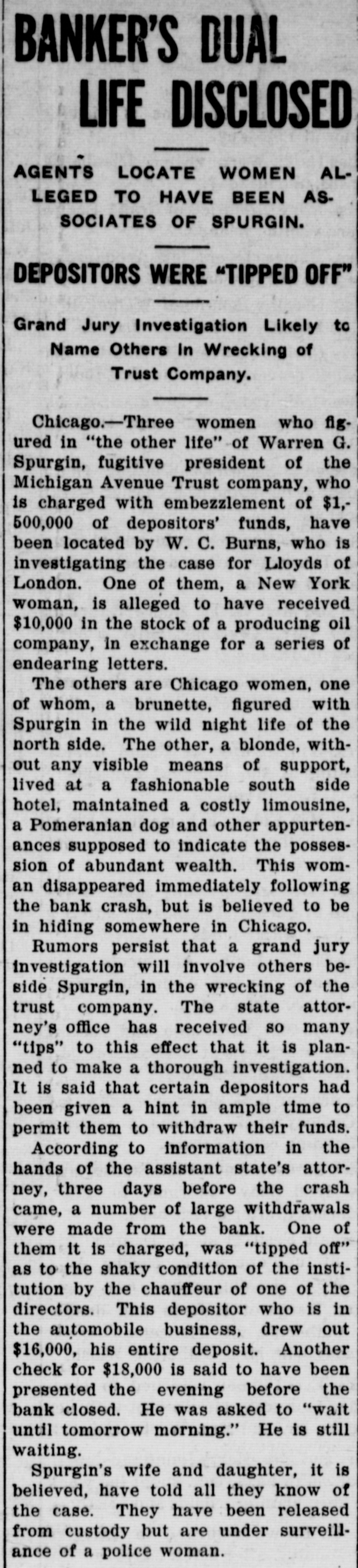 BANKER'S DUAL LIFE DISCLOSED AGENTS LOCATE WOMEN ALLEGED TO HAVE BEEN AS. SOCIATES OF SPURGIN. DEPOSITORS WERE "TIPPED OFF" Grand Jury Investigation Likely to Name Others In Wrecking of Trust Company. Chicago.-Three women who fig. ured in "the other life" of Warren G. Spurgin, fugitive president of the Michigan Avenue Trust company, who is charged with embezzlement of $1,500,000 of depositors' funds, have been located by W. C. Burns, who is investigating the case for Lloyds of London. One of them, a New York woman, is alleged to have received $10,000 in the stock of a producing oil company, in exchange for a series of endearing letters. The others are Chicago women, one of whom, a brunette, figured with Spurgin in the wild night life of the north side. The other, a blonde, without any visible means of support, lived at a fashionable south side hotel, maintained a costly limousine, a Pomeranian dog and other appurtenances supposed to indicate the possession of abundant wealth. This woman disappeared immediately following the bank crash, but is believed to be in hiding somewhere in Chicago. Rumors persist that a grand jury investigation will involve others beside Spurgin, in the wrecking of the trust company. The state attorney's office has received so many "tips" to this effect that it is planned to make a thorough investigation. It is said that certain depositors had been given a hint in ample time to permit them to withdraw their funds. According to information in the hands of the assistant state's attorney, three days before the crash came, a number of large withdrawals were made from the bank. One of them it is charged, was "tipped off" as to the shaky condition of the institution by the chauffeur of one of the directors. This depositor who is in the automobile business, drew out $16,000, his entire deposit. Another check for $18,000 is said to have been presented the evening before the bank closed. He was asked to "wait until tomorrow morning." He is still waiting. Spurgin's wife and daughter, it is believed, have told all they know of the case. They have been released from custody but are under surveillance of a police woman.