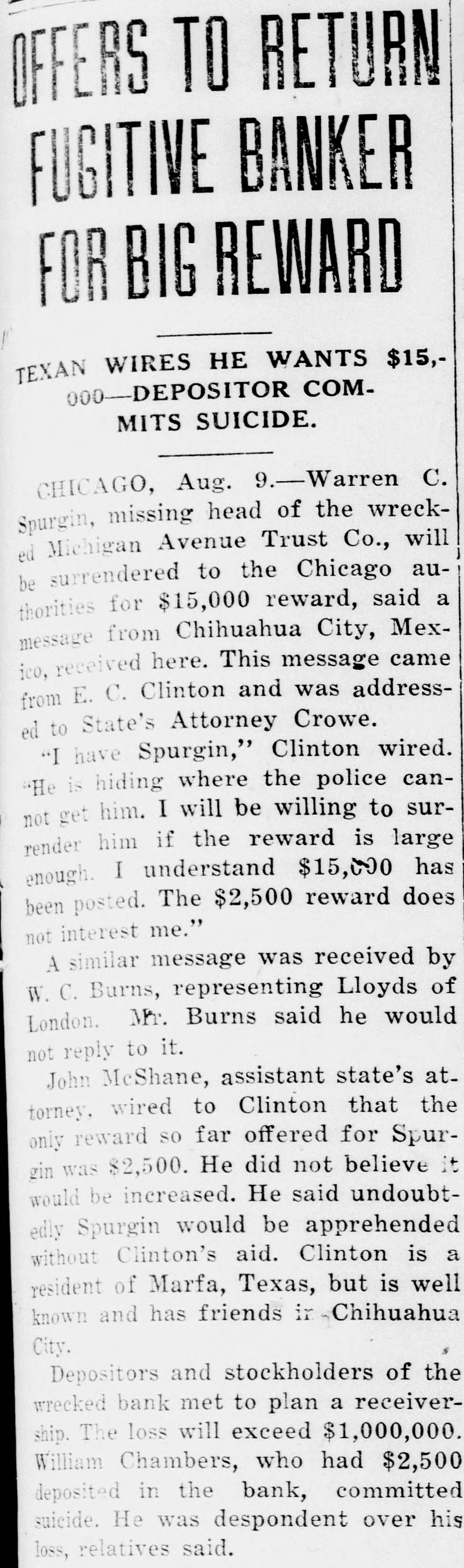 OFFERS TO RETUR FUGITIVE BANKER FOR BIG REWARD TEXAN WIRES HE WANTS $15,000-DEPOSITOR COMMITS SUICIDE. CHICAGO, Aug. 9.-Warren C. Spurgin, missing head of the wrecked Michigan Avenue Trust Co., will be surrendered to the Chicago authorities for $15,000 reward, said a message from Chihuahua City, Mexico, received here. This message came from E. C. Clinton and was addressed to State's Attorney Crowe. "I have Spurgin," Clinton wired. He is hiding where the police cannot get him. I will be willing to surrender him if the reward is large enough. I understand $15,000 has been posted. The $2,500 reward does not interest me." A similar message was received by W. C. Burns, representing Lloyds of London. Mr. Burns said he would not reply to it. John McShane, assistant state's attorney, wired to Clinton that the only reward SO far offered for Spurgin was $2,500. He did not believe it would be increased. He said undoubtedly Spurgin would be apprehended without Clinton's aid. Clinton is a resident of Marfa, Texas, but is well known and has friends in Chihuahua City. Depositors and stockholders of the wrecked bank met to plan a receivership. The loss will exceed $1,000,000. William Chambers, who had $2,500 deposited in the bank, committed suicide. He was despondent over his loss, relatives said.