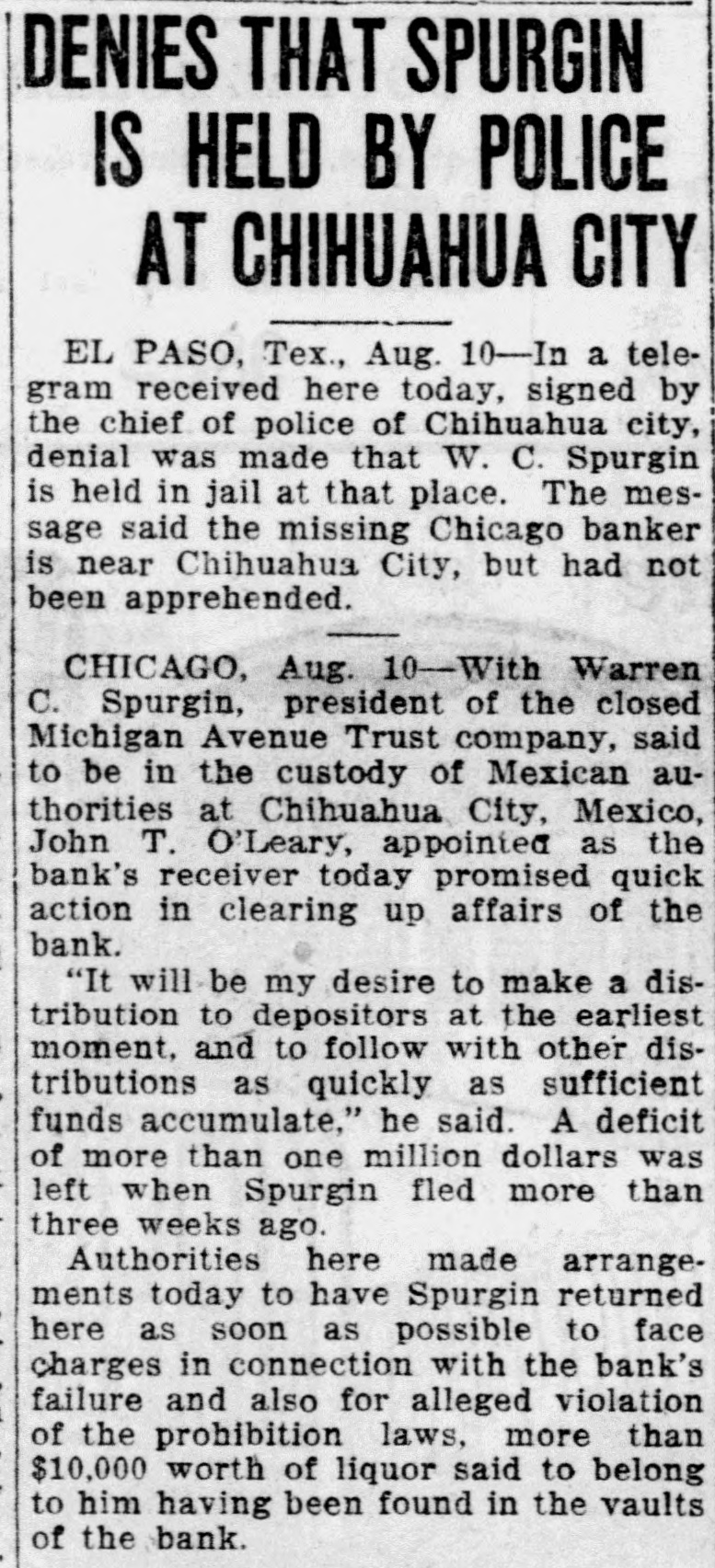 DENIES THAT SPURGIN IS HELD BY POLICE AT CHIHUAHUA CITY EL PASO, Tex., Aug. 10-In a telegram received here today, signed by the chief of police of Chihuahua city, denial was made that W. C. Spurgin is held in jail at that place. The message said the missing Chicago banker is near Chihuahua City, but had not been apprehended. CHICAGO, Aug. 10-With Warren C. Spurgin, president of the closed Michigan Avenue Trust company, said to be in the custody of Mexican authorities at Chihuahua City, Mexico, John T. O'Leary, appointed as the bank's receiver today promised quick action in clearing up affairs of the bank. "It will be my desire to make a distribution to depositors at the earliest moment, and to follow with other distributions as quickly as sufficient funds accumulate," he said. A deficit of more than one million dollars was left when Spurgin fled more than three weeks ago. Authorities here made arrangements today to have Spurgin returned here as soon as possible to face charges in connection with the bank's failure and also for alleged violation of the prohibition laws, more than $10,000 worth of liquor said to belong to him having been found in the vaults of the bank.