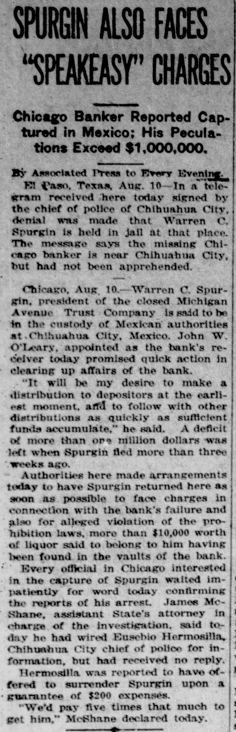 SPURGIN ALSO FACES "SPEAKEASY" CHARGES Chicago Banker Reported Captured in Mexico: His Peculations Exceed $1,000,000. Associated Press to Every Evening. El Paso, Texas, Aug. 10-In a telegram received here today signed by the chief of police of Chihuahua City, denial was made that Warren C. Spurgin is held in jail at that place. The message says the missing Chicago banker is near Chihuahua City, but had not been apprehended. Chicago, Aug. 10.-Warren C. Spurgin, president of the closed Michigan Avenue Trust Company is said to be in the custody of Mexican authorities at.Chihuahua City, Mexico. John W. O'Leary, appointed as the bank's redeiver today promised quick action in clearing up affairs of the bank. "It will be my desire to make a distribution to depositors at the earliest moment, and to follow with other distributions as quickly as sufficient funds accumulate," he said. A deficit of more than one million dollars was left when Spurgin fled more than three weeks ago. Authorities here made arrangements today to have Spurgin returned here as soon as possible to face charges in connection with the bank's failure and also for alleged violation of the prohibition laws, more than $10,000 worth of liquor said to belong to him having been found in the vaults of the bank. : Every official in Chicago interested in the capture of Spurgin waited impatiently for word today confirming the reports of his arrest. James McShane, assistant State's attorney in charge of the investigation, said today he had wired Eusebio Hermosilla, Chihuahua City chief of police for information, but had received no reply. A Hermosilla was reported to have offered to surrender Spurgin upon a 1 guarantee of $200 expenses. $ "We'd pay five times that much to 1 get him," McShane declared today. 6 -