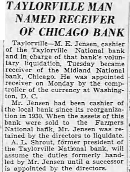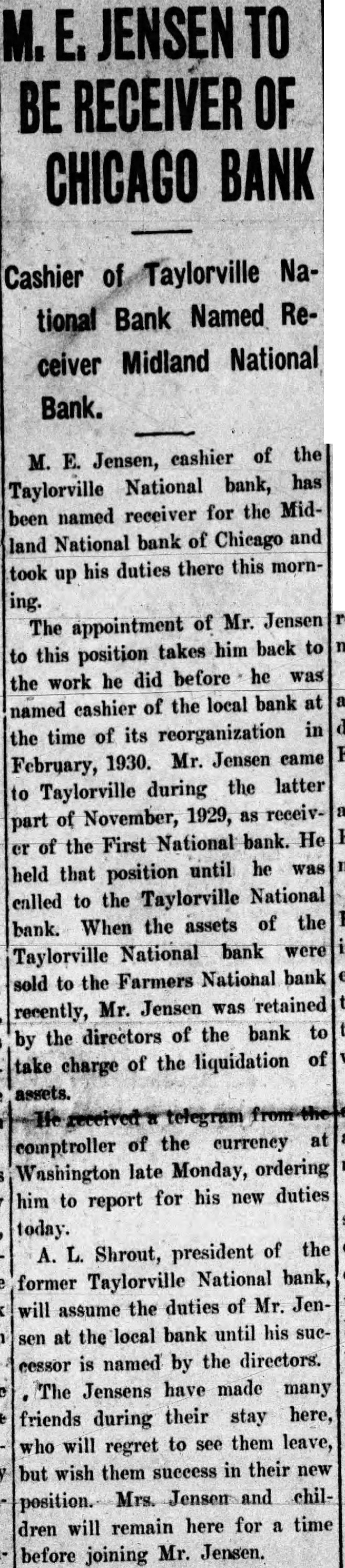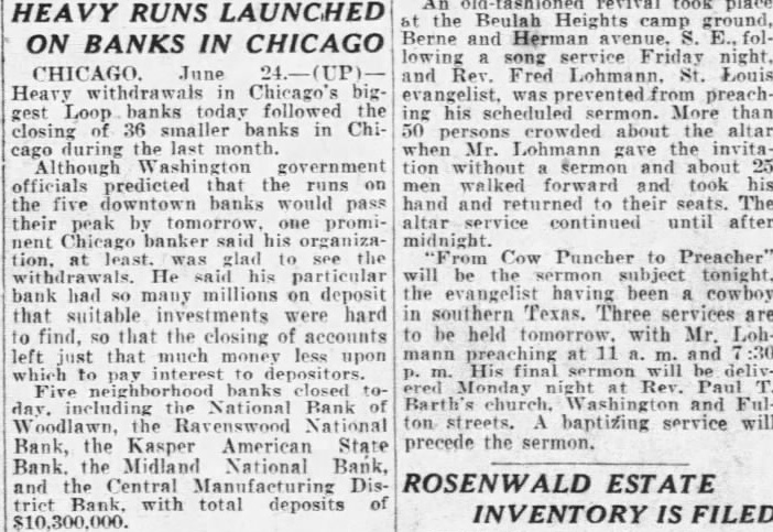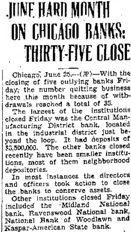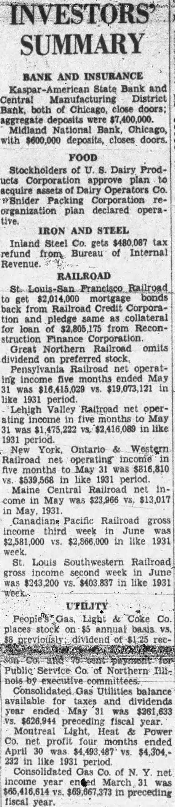 INVESTORS' SUMMARY BANK AND INSURANCE Kaspar-American State Bank and Central Manufacturing District Bank, both of Chicago, close doors; aggregate deposits were $7,400,000. Midland National Bank, Chicago, with $600,000 deposits, closes doors. FOOD Stockholders of U. S. Dairy Products Corporation approve plan to acquire assets of Dairy Operators Co. *Snider Packing Corporation reorganization plan declared opeΓative. IRON AND STEEL Inland Steel Co. gets $480,087 tax refund from Bureau of Internal Revenue. RAILROAD St. Louis-San Francisco Railroad to get $2,014,000 mortgage bonds back from Railroad Credit Corporation and pledge same as collateral for loan of $2,805,175 from Reconstruction Finance Corporation. Great Northern Railroad omits dividend on preferred stock. Pensylvania Railroad net operating income five months ended May was $16,415,029 vs. $19,073,121 in like 1931 period. Lehigh Valley Railroad net operating income in five months to May was $1 475,222 vs. $2,416,089 in like 1931 New York, Ontario & Western Railroad net operating income in five months to May 31 was $816,810 vs. $539,568 in like 1931 period. Maine Central Railroad net income in May was $23,966 vs, $13,017 in 1931. Canadian Pacific Railroad gross income third week in June was $2,581,000 vs. $2,866,000 in like 1931 week. St. Louis Southwestern Railroad gross income second week in June was $243,200 VS. $403.837 in like 1931 UTILITY People's Gas, Light & Coke Co. places stock on $5 annual basis vs. dividend of $1.25 recand payment Public Service Co. of Northern Illi nois by executive committees. Consolidated Gas Utilities balance available for taxes and dividends year ended May 31 was $261,633 vs. $626,944 preceding fiscal year. Montreal Light, Heat & Power Co. net profit four months ended April 30 was $4,493. 487 vs. $4,304,232 in like 1931 period. Consolidated Gas Co. of N. Y. net income year ended March 31 was $65,416,614 vs. $69,667,373 in preceding fiscal year.