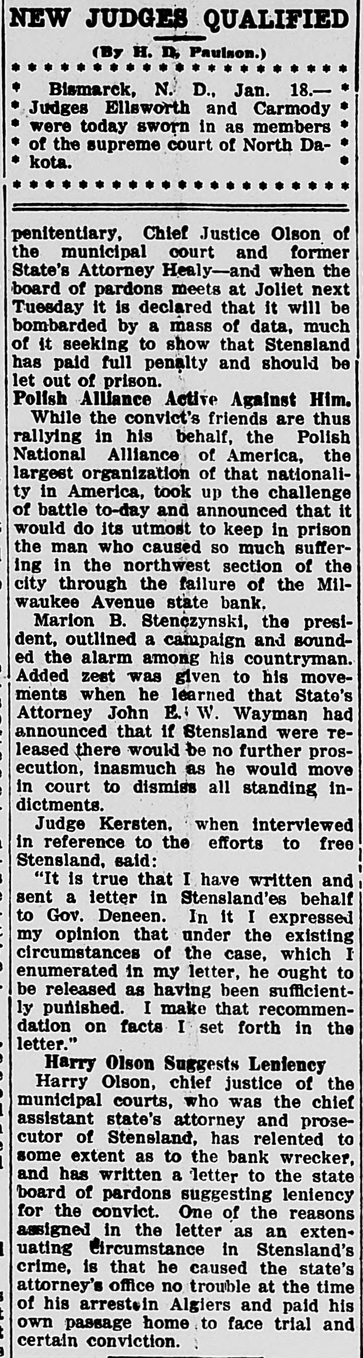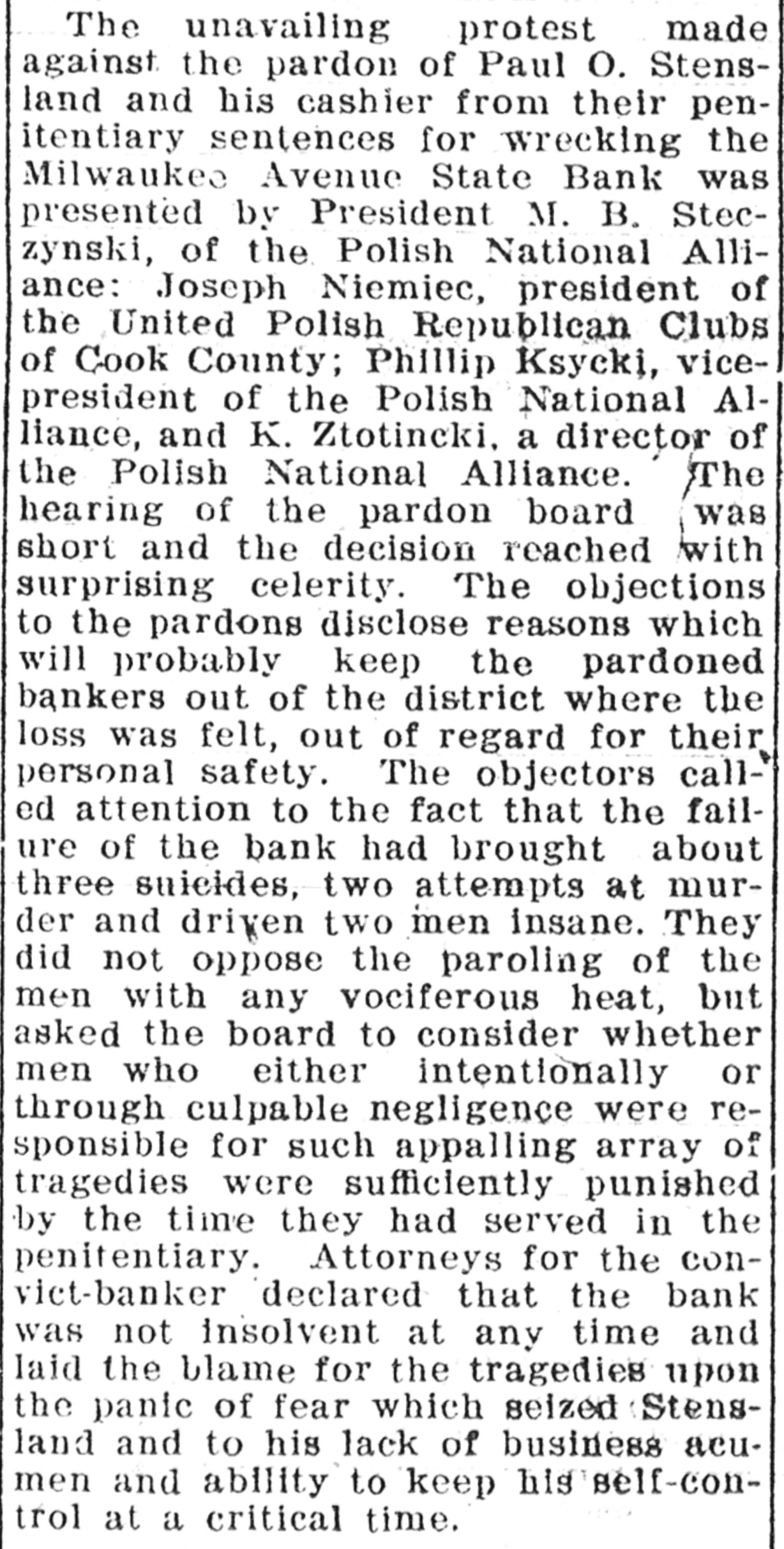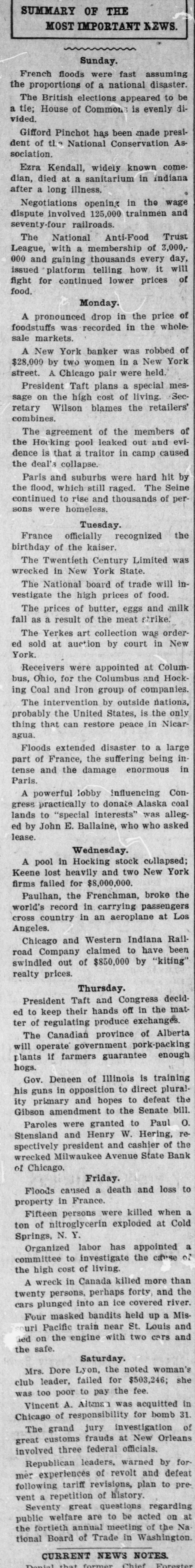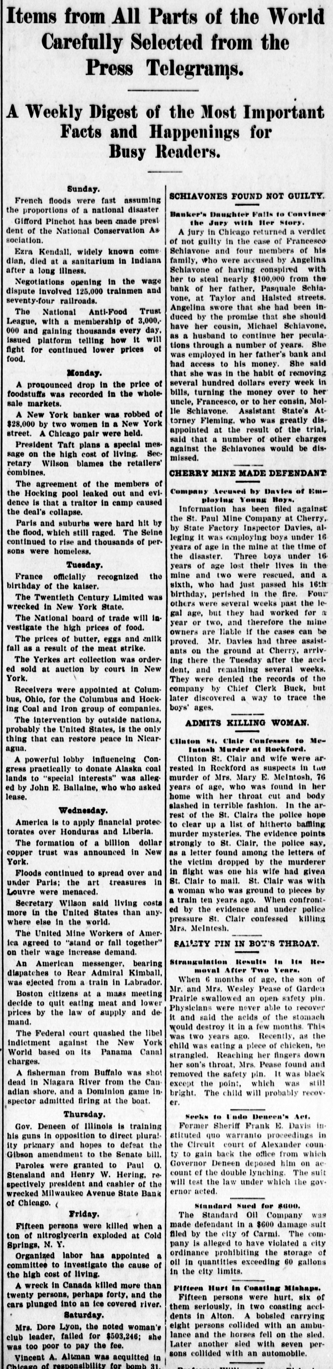 Items from All Parts of the World Carefully Selected from the Press Telegrams. A Weekly Digest of the Most Important Facts and Happenings for Busy Readers. Sunday. SCHIAVONES FOUND NOT GUILTY. French floods were fast assuming the proportions of a national disaster Banker's Daughter Falls to Convince Gifford Pinchot has been made presithe Jury with Her Story. dent of the National Conservation As A jury in Chicago returned a verdict sociation. of not guilty in the case of Francesco Schiavone and four members of his Ezra Kendall, widely known come family, who were accused by Angelina dian, died at a sanitarium in Indiana Schiavone of having conspired with after a long illness. her to steal nearly $100,000 from the Negotiations opening in the wage bank of her father, Pasquale Schiadispute involved 125,000 trainmen and vone, at Taylor and Halsted streets. seventy-four railroads. Angelina swore that she had been inThe National Anti-Food Trust duced by the promise that she should League, with a membership of 3,000,have her cousin, Michael Schiavone, 000 and gaining thousands every day. as a husband to continue her peculaissued platform telling how it will tions through a number of years. She fight for continued lower prices of was employed in her father's bank and food. had access to his money. She said that she was in the habit of removing Monday. several hundred dollars every week in A pronounced drop in the price of bills, turning the money over to her foodstuffs was recorded in the wholeuncle, Francesco, or to her consin, Molsale markets. lie Schiavone. Assistant State's AtA New York banker was robbed of torney Fleming. who was greatly dis$28,000 by two women in a New York appointed at the result of the trial, street. A Chicago pair were held. said that a number of other charges President Taft plans a special mesagainst the Schiavones would be dissage on the high cost of living. Secmissed. retary Wilson blames the retailers' combines. CHERRY MINE MADE DEFENDANT The agreement of the members of Company Accused by Davies of Emthe Hocking pool leaked out and eviploying Young Boys. dence is that a traitor in camp caused Information has been filed against the deal's collapse. the St. Paul Mine Company at Cherry, Paris and suburbs were hard hit by by State Factory Inspector Davies, althe flood, which still raged. The Seine leging it was employing boys under 16 continued to rise and thousands of peryears of age in the mine at the time of sons were homeless. the disaster. Three boys under 16 Tuesday. years of age lost their lives in the mine and two were rescued. and a France officially recognized the sixth, who had just passed his 16th birthday of the kaiser. birthday, perished in the fire. Four The Twentieth Century Limited was others were several weeks past the lewrecked in New York State. gal age, but they had worked for a The National board of trade will inyear or two, and therefore the mine vestigate the high prices of food. owners are liable if the cases can be The prices of butter, eggs and milk proved. Mr. Davies had three assistfall as a result of the meat strike. ants on the ground at Cherry, arrivThe Yerkes art collection was ordering there the Tuesday after the accied sold at auction by court in New dent, and remaining several weeks. York. They were denied the records of the company by Chief Clerk Buck, but Receivers were appointed at Columlater discovered a way to trace the bus, Ohio, for the Columbus and Hockboys' ages. ing Coal and Iron group of companies. The intervention by outside nations, ADMITS KILLING WOMAN. probably the United States, is the only thing that can restore peace in NicarClinton St. Clair Confesses to Meagua. Intosh Murder at Rockford. Clinton St. Clair and wife were arA powerful lobby influencing Conrested in Rockford as suspects in the gress practically to donate Alaska coal murder of Mrs. Mary E. McIntosh, 76 lands to "special interests" was alleg. years of age, who was found in her ed by John E. Ballaine, who who asked home with her throat cut and body lease. slashed in terrible fashion. In the arWednesday. rest of the St. Clairs the police hope America is to apply financial protecto clear up a list of hitherto baffling torates over Honduras and Liberia. murder mysteries. The evidence points The formation of a billion dollar strongly to St. Clair. the police say, as a letter found among the letters of copper trust was announced in New York. the victim dropped by the murderer in flight was one his wife had given Floods continued to spread over and St. Clair to mail. St. Clair was with under Paris: the art treasures in a woman who was ground to pieces by Louvre were menaced. a train ten years ago. When confrontSecretary Wilson said living costs ed by the evidence and under police more in the United States than anypressure St. Clair confessed killing where else in the world. Mrs. MeIntesh. The United Mine Workers of AmerSALETY PIN IN BOY'S THROAT. ica agreed to "stand or fall together" on their wage increase demand. Strangulation Results in Its ReAn American messenger, bearing moval After Two Years. dispatches to Rear Admiral Kimball, When 6 months of age, the son of was ejected from a train in Labrador. Mr. and Mrs. Wesley Pease of Garden Boston citizens at a mass meeting Prairle swallowed an open safety pin. decide to quit eating meat and lower Physicians were never able to recover prices by the law of supply and deit and said the acids of the stomach mand. would destroy it in a few months This The Federal court quashed the libel was two years ago. Recently, as the indictment against the New York child was eating a piece of chicken, he World based on its Panama Canal strangled. Reaching her fingers down charges. her son's throat, Mrs. Pease found and A fisherman from Buffalo was shot removed the safety pin. It was black dead in Niagara River from the Canexcept the point, which was still adian shore, and a Dominion game inbright. The child will probably recover. 
