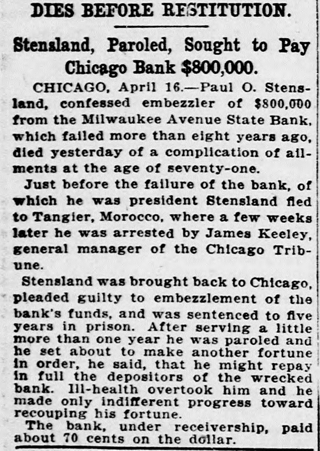 # DIES BEFORE RESTITUTION. Stensland, Paroled, Sought to Pay Chicago Bank $800,000. CHICAGO, April 16. - Paul O. Stensland, confessed embezzler of $800,000 from the Milwaukee Avenue State Bank, which failed more than eight years ago, died yesterday of a complication of ailments at the age of seventy-one. Just before the failure of the bank, of which he was president Stensland fled to Tangier, Morocco, where a few weeks later he was arrested by James Keeley, general manager of the Chicago Tribune. Stensland was brought back to Chicago, pleaded guilty to embezzlement of the bank's funds, and was sentenced to five years in prison. After serving a little more than one year he was paroled and he set about to make another fortune in order, he said, that he might repay in full the depositors of the wrecked bank. Ill-health overtook him and he made only indifferent progress toward recouping his fortune. The bank, under receivership, paid about 70 cents on the dollar.
