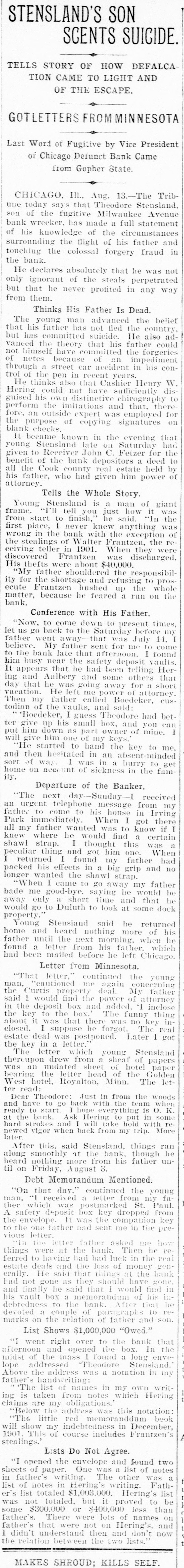 # STENSLAND'S SON # SCENTS SUICIDE. TELLS STORY OF HOW DEFALCA- TION CAME TO LIGHT AND OF THE ESCAPE. GOTLETTERS FROM MINNESOTA Last Word of Fugitive by Vice President of Chicago Defunct Bank Came from Gopher State. CHICAGO, Ill., Aug. 13. The Tribune today says that Theodore Stensland, son of the fugitive Milwaukee Avenue bank wrecker, has made a full statement of his knowledge of the circumstances surrounding the flight of his father and touching the colossal forgery fraud in the bank. He declares absolutely that he was not only ignorant of the steals perpetrated but that he never profited in any way from them. Thinks His Father Is Dead. The young man advanced the belief that his father has not fled the country, but has committed suicide. He also advanced the theory that his father could not himself have committed the forgeries of notes because of an impediment through a street car accident in his control of the pen in recent years. He thinks also that Cashier Henry W. Hering could not have sufficiently disguised his own distinctive chirography to perform the imitations and that, therefore, an outside expert was employed for the purpose of copying signatures on blank checks. It became known in the evening that young Stensland late on Saturday had given to Receiver John C. Fetzer for the benefit of the bank depositors a deed to all the Cook county real estate held by his father, who had given him power of attorney. Tells the Whole Story. Young Stensland is a man of giant frame. "I'll tell you just how it was from start to finish," he said. "In the first place, I never knew anything was wrong in the bank with the exception of the stealings of Walter Frantzen, the receiving teller in 1901. When they were discovered Frantzen was discharged. His thefts were about $40,000. "My father shouldered the responsibility for the shortage and refusing to prosecute Frantzen hushed up the whole matter, because he feared a run on the bank. Conference with His Father. "Now, to come down to present times, let us go back to the Saturday before my father went away that was July 14, I believe. My father sent for me to come to the bank late that afternoon. I found him busy near the safety deposit vaults. It appears that he had been telling Hering and Aalbery and some others that day that he was going away for a short vacation. He left me power of attorney. Then my father called Boedeker, custodian of the vaults, and said: 'Boedeker, I guess Theodore had better give up his small box, and you can put him down as part owner of mine. I will give him one of my keys.' "He started to hand the key to me, and then hesitated in an absent-minded sort of way. I was in a hurry to get home on account of sickness in the family. Departure of the Banker. "The next day-Sunday-I received an urgent telephone message from my father to come to his house in Irving Park immediately. When I got there all my father wanted was to know if I knew where he would find a certain shawl strap. I thought this was a peculiar thing and got him one. When I returned I found my father had packed his effects in a big grip and no longer wanted the shawl strap. "When I came to go away my father bade me good-bye, saying he would be away only a short time and that he would go to Duluth to look at some dock property." Young Stensland said he returned home and heard nothing more of his father until the next morning, when he found a letter from his father, which had been mailed before he left Chicago. Letter from Minnesota. "That letter," continued the young man, "cautioned me again concerning the Curtis property deal. My father said I would find the power of attorney in the deposit box and added, 'I inclose the key to the box. The funny thing about it was that there was no key inclosed. I suppose he forgot. The real estate deal was postponed. Later I got the key in a letter." The letter which young Stensland thereupon drew from a sheaf of papers was an undated sheet of hotel paper bearing the letter head of the Golden West hotel, Royalton, Minn. The letter read: Dear Theodore: Just in from the woods and have to go back with the team when ready to start. I hope everything is O. K. at the bank. Ask Hering to put in some hard strokes and I will take hold with renewed vigor when back from my trip. More later. After this, said Stensland, things ran along smoothly at the bank, though he heard nothing more from his father until on Friday, August 3. Debt Memorandum Mentioned. "On that day," continued the young man, "I received a letter from my father which was postmarked St. Paul. A safety deposit box key dropped from the envelope. It was the companion key to the one father had sent me in the previous letter. "In the letter father asked me how things were at the bank. Then he referred to having bad bad luck in the real estate deals and the loss of money generally. He said that things at the bank had not gone as they should have gone, and finally he said that I would find in his vault box a memorandum of his indebtedness to the bank. After that he devoted a couple of paragraphs to remarks on the relation of father and son. List Shows $1,000,000 "Owed." "I went right over to the bank that afternoon and opened the box. In the midst of the mass I found a long envelope addressed "Theodore Stensland.' Above the address was a notation in my father's handwriting: "The list of names in my own writing is taken from notes which Hering claims are my obligations.' "Below the address was this notation: "The little red memorandum book will show my indebtedness in December, 1901. This of course includes Frantzen's stealings.' Lists Do Not Agree. "I opened the envelope and found two sheets of paper. One was a list of notes in father's writing. The other was a list of notes in Hering's writing. Father's list totaled $1,003,000. Hering's list was not totaled, but it proved to be some $300.000 or $400,000 less than father's. There were lots of names on father's that were not on Heri