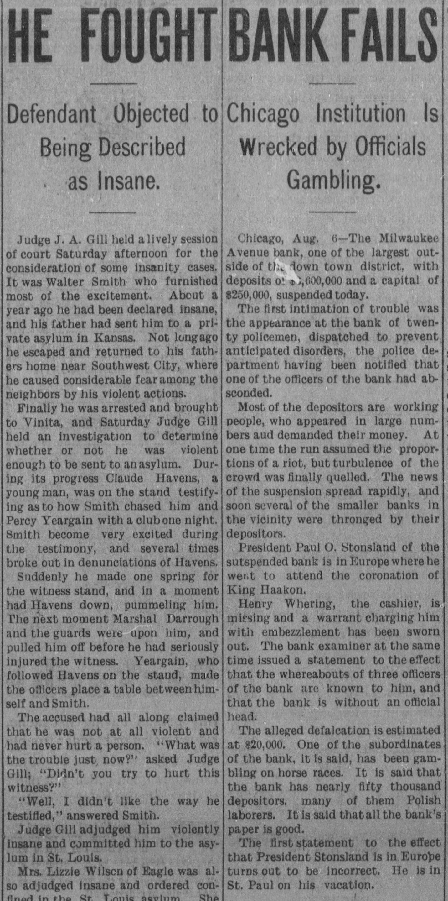 BANK FAILS HE FOUGHT Defendant Objected to Chicago Institution Is Wrecked by Officials Being Described as Insane. Gambling. Chicago, Aug. 6-The Milwaukee Judge J. A. Gill held a lively session Avenue bank, one of the largest outof court Saturday afternoon for the side of the down town district, with consideration of some insanity cases. It was Walter Smith who furnished deposits of 600,000 and a capital of most of the excitement. About a $250,000, suspended today. The first intimation of trouble was year ago he had been declared insane, and his father had sent him to a prithe appearance at the bank of twenty policemen, dispatched to prevent vate asylum in Kansas. Not longago anticipated disorders, the police dehe escaped and returned to his fathers home near Southwest City, where partment having been notified that one of the officers of the bank had abhe caused considerable fear among the sconded. neighbors by his violent actions. Most of the depositors are working Finally he was arrested and brought people, who appeared in large numto Vinita, and Saturday Judge Gill bers aud demanded their money. At held an investigation to determine whether or not he was violent one time the run assumed the proportions of a riot, but turbulence of the enough to be sent to asylum. Durcrowd was finally quelled. The news ing its progress Claude Havens, a of the suspension spread rapidly, and young man, was on the stand testifysoon several of the smaller banks in ing as to how Smith chased him and the vicinity were thronged by their Percy Yeargain with a clubone night. depositors. Smith become very excited during President Paul O. Stonsland of the the testimony, and several times broke out in denunciations of Havens. sutspended bank is in Europe where he went to attend the coronation of Suddenly he made one spring for King Haakon. the witness stand, and in a moment Henry Whering, the cashier, is had Havens down, pummeling him. missing and a warrant charging him The next moment Marshal Darrough with embezzlement has been sworn and the guards were upon him, and out. The bank examiner at the same pulled him off before he had seriously time issued a statement to the effect injured the witness. Yeargain, who that the whereabouts of three officers followed Havens on the stand, made of the bank are known to him, and the officers place a table between himthat the bank is without an official self and Smith. head. The accused had all along claimed that he was not at all violent and The alleged defalcation is estimated at $20,000. One of the subordinates had never hurt a person. "What was of the bank, it is said, has been gamthe trouble just now?'' asked Judge bling on horse races. It is said that Gill; "Didn't you try to hurt this witness?" the bank has nearly fifty thousand depositors. many of them Polish "Well, I didn't like the way he laborers. It is said that all the bank's testifled,' answered Smith. paper is good. Judge Gill adjudged him violently The first statement to the effect insane and committed him to the asylum in St. Louis. that President Stonsland is in Europe turns out to be incorrect. He is in Mrs. Lizzie Wilson of Eagle was alSt. Paul on his vacation. so adjudged insane and ordered confined in Louis asylum She