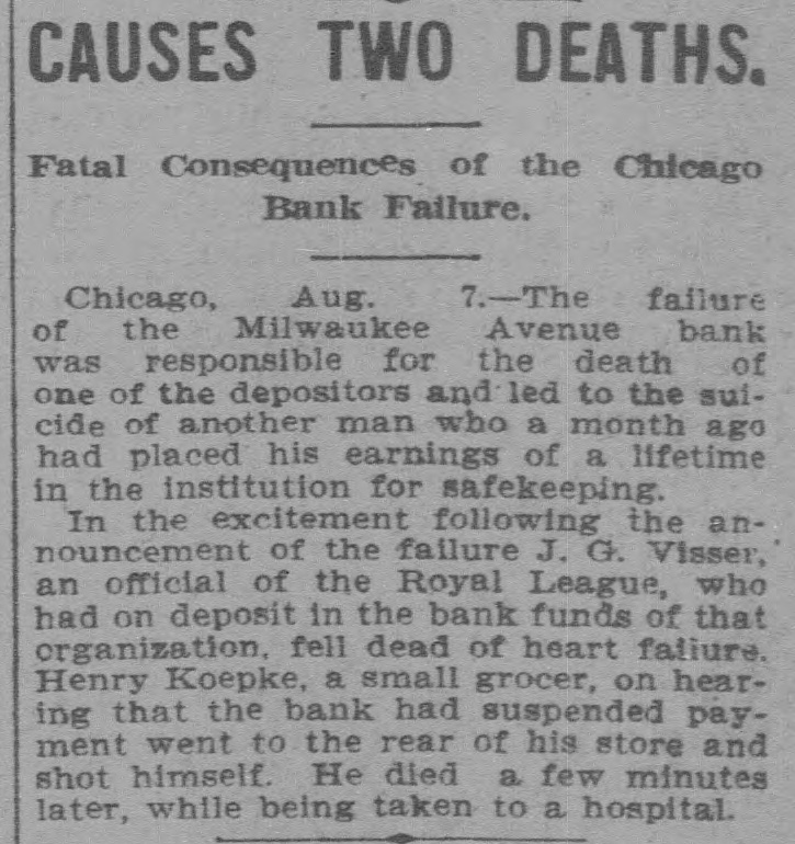 CAUSES TWO DEATHS. Fatal Consequences of the Chicago Bank Failure. Aug. .-The 3 failure Chicago, of the Milwaukee Avenue bank was responsible for the death of one of the depositors and led to the suicide of another man who a month ago had placed his earnings of a lifetime in the institution for safekeeping. In the excitement following the announcement of the failure J. G. Visser, an official of the Royal League, who had on deposit in the bank funds of that organization, fell dead of heart failure. Henry Koepke, a small grocer, on hearing that the bank had suspended payment went to the rear of his store and shot himself. He died a few minutes later, while being taken to a hospital.