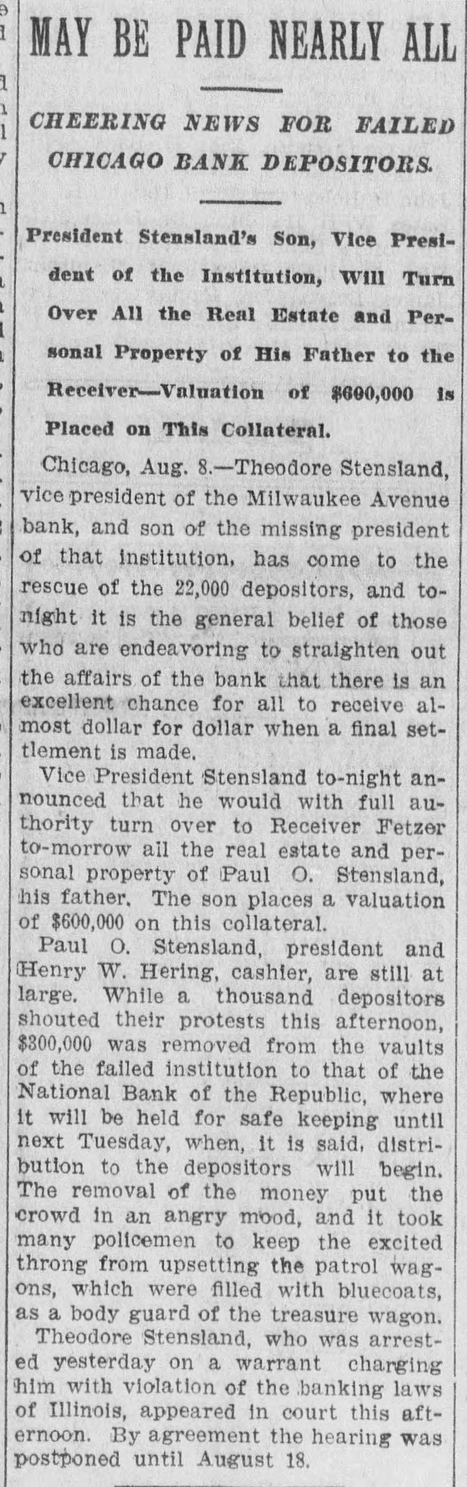 e MAY BE PAID NEARLY ALL CHEERING NEWS FOR FAILED CHICAGO BANK DEPOSITORS. President Stensland's Son, Vice President of the Institution, Will Turn Over All the Real Estate and Personal Property of His Father to the Receiver-Valuation of $600,000 is Placed on This Collateral. Chicago, Aug. 8.-Theodore Stensland, vice president of the Milwaukee Avenue bank, and son of the missing president of that institution, has come to the rescue of the 22,000 depositors, and tonight it is the general belief of those who are endeavoring to straighten out the affairs of the bank that there is an excellent chance for all to receive almost dollar for dollar when a final settlement is made. Vice President Stensland to-night announced that he would with full authority turn over to Receiver Fetzer to-morrow all the real estate and personal property of Paul O. Stensland, this father, The son places a valuation of $600,000 on this collateral. Paul o. Stensland, president and Henry W. Hering, cashier, are still at large. While a thousand depositors shouted their protests this afternoon, $300,000 was removed from the vaults of the failed institution to that of the National Bank of the Republic, where it will be held for safe keeping until next Tuesday, when, it is said, distribution to the depositors will begin. The removal of the money put the crowd in an angry mood, and it took many policemen to keep the excited throng from upsetting the patrol wagons, which were filled with bluecoats, as a body guard of the treasure wagon. Theodore Stensland, who was arrested yesterday on a warrant charging him with violation of the banking laws of Illinois, appeared in court this afternoon. By agreement the hearing was postponed until August 18.