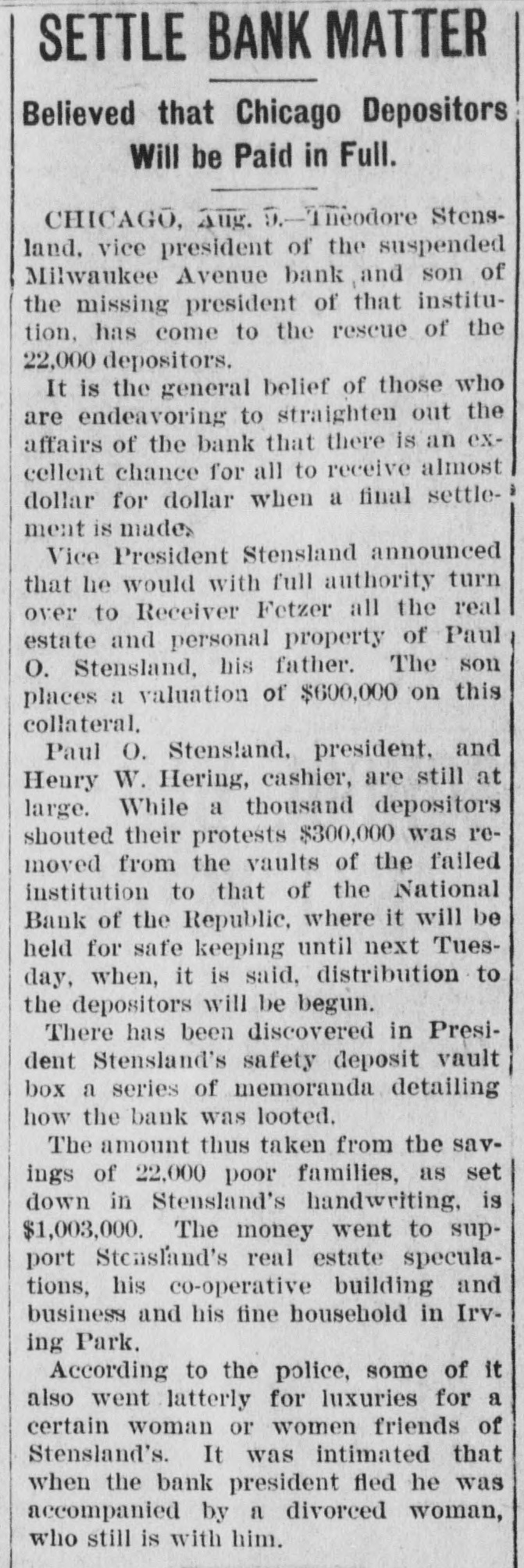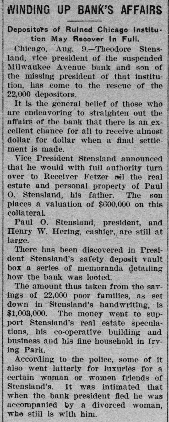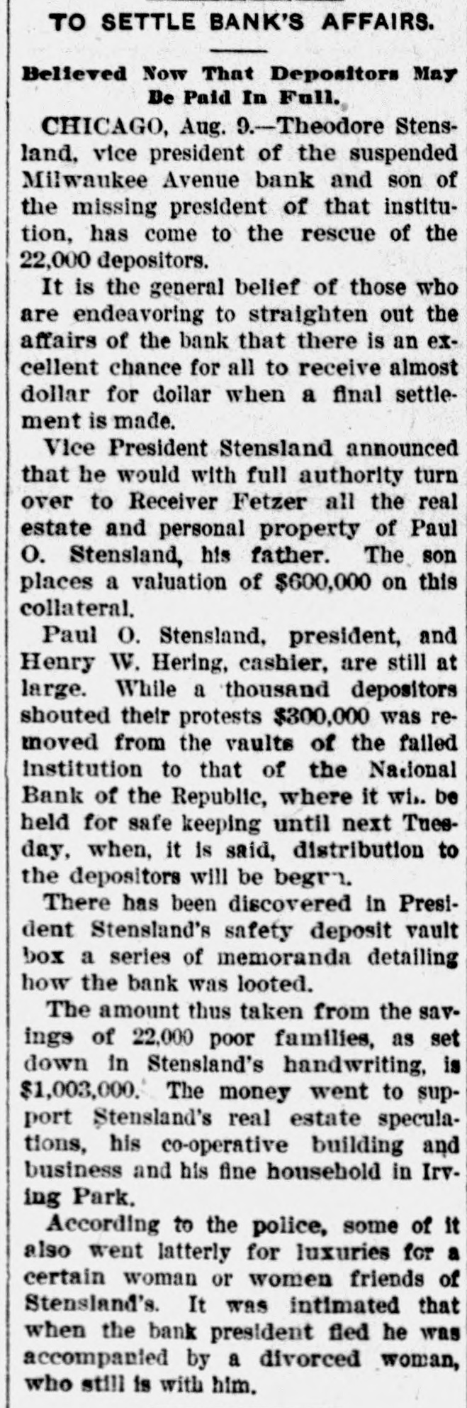 WINDING UP BANK'S AFFAIRS Depositops of Ruined Chicago Institution May Recover In Full. Chicago, Aug. 9.-Theodore Stensland, vice president of the suspended Milwaukee Avenue bank and son of the missing president of that institution, has come to the rescue of the 22,000 depositors. It is the general belief of those who are endeavoring to straighten out the affairs of the bank that there is an excellent chance for all to receive almost dollar for dollar when a final settlement is made. Vice President Stensland announced that he would with full authority turn over to Receiver Fetzer all the real estate and personal property of Paul O. Stensland, his father. The son places a valuation of $600,000 on this collateral. Paul O. Stensland, president, and Henry W. Hering, cashier, are still at large. There has been discovered in President Stensland's safety deposit vault box a series of memoranda detailing how the bank was looted. The amount thus taken from the savings of 22,000 poor families, as set down in Stensland's handwriting, is $1,003,000. The money went to support Stensland's real estate speculations, his co-operative building and business and his fine household in Irving Park. According to the police, some of it also went latterly for luxuries for a certain woman or women friends of Stensland's. It was intimated that when the bank president fled he was accompanied by a divorced woman, who still is with him.