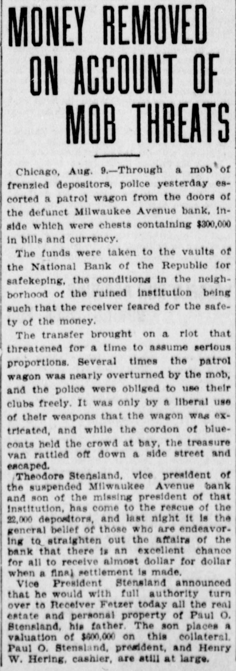 MONEY REMOVED ON ACCOUNT OF MOB THREATS Chicago, Aug. 9.-Through a mob of frenzied depositors, police yesterday escorted a patrol wagon from the doors of the defunct Milwaukee Avenue bank, inside which were chests containing $300,000 in bills and currency. The funds were taken to the vaults of the National Bank of the Republic for safekeping, the conditions in the neighborhood of the ruined institution being such that the receiver feared for the safety of the money. The transfer brought on a riot that threatened for a time to assume serious proportions. Several times the patrol wagon was nearly overturned by the mob, and the police were obliged to use their clubs freely. It was only by a liberal use of their weapons that the wagon was extricated, and while the cordon of bluecoats held the crowd at bay, the treasure van rattled off down a side street and escaped. Theodore Stensland, vice president of the suspended Mfiwaukee Avenue bank and son of the missing president of that Institution, has come to the rescue of the 22,000 depositors, and last night It is the general belief of those who are endeavor. Ing to straighten out the affairs of the bank that there is an excellent chance for all to receive almost dollar for dollar when a final settlement is made. Vice President Stensland announced that he would with full authority turn over to Receiver Fetzer today all the real estate and personal property of Paul O. Stensland, his father. The son places a valuation of $600,000 on this collateral Paul O. Stensland, president, and Henry W. Hering, cashier, are still at large.