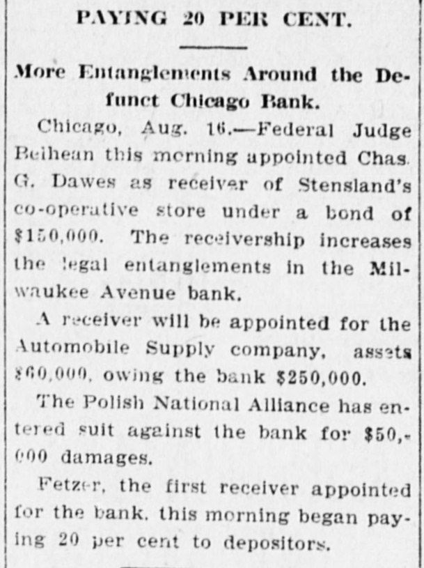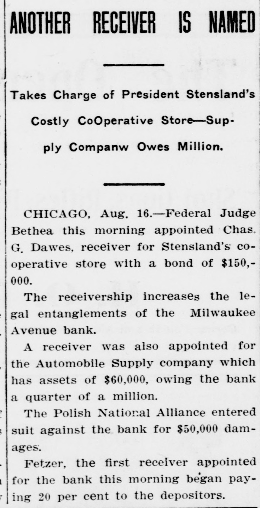 ANOTHER RECEIVER IS NAMED Takes Charge of President Stensland's Costly CoOperative Store-Supply Companw Owes Million. CHICAGO, Aug. 16.-Federal Judge Bethea this morning appointed Chas. G. Dawes, receiver for Stensland's cooperative store with a bond of $150,000. The receivership increases the legal entanglements of the Milwaukee Avenue bank. A receiver was also appointed for the Automobile Supply company which has assets of $60,000, owing the bank a quarter of a million. The Polish National Alliance entered suit against the bank for $50,000 damages. Fetzer, the first receiver appointed for the bank this morning began paying 20 per cent to the depositors.