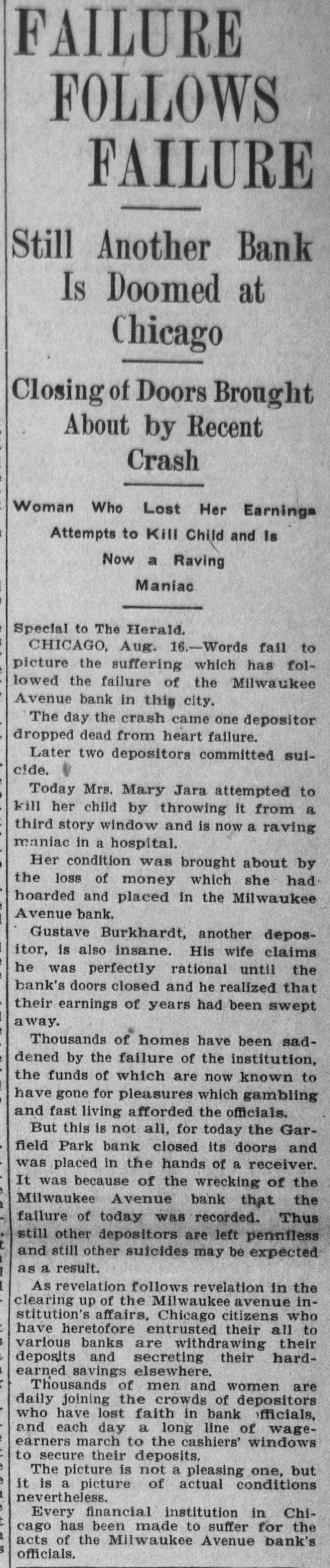 FAILURE FOLLOWS FAILURE Still Another Bank Is Doomed at Chicago Closing of Doors Brought About by Recent Crash Woman Who Lost Her Earnings Attempts to Kill Child and Is Now a Raving Maniac Special to The Herald. CHICAGO, Aug. 16.-Words fail to picture the suffering which has followed the failure of the Milwaukee Avenue bank in this city. The day the crash came one depositor dropped dead from heart failure. Later two depositors committed suicide. Today Mrs. Mary Jara attempted to kill her child by throwing it from a third story window and is now a raving maniac in a hospital. Her condition was brought about by the loss of money which she had hoarded and placed in the Milwaukee Avenue bank. Gustave Burkhardt, another depositor, is also insane. His wife claims he was perfectly rational until the bank's doors closed and he realized that their earnings of years had been swept away. Thousands of homes have been saddened by the failure of the institution, the funds of which are now known to have gone for pleasures which gambling and fast living afforded the officials. But this is not all, for today the Garfield Park bank closed its doors and was placed in the hands of a receiver. It was because of the wrecking of the Milwaukee Avenue bank that the failure of today was recorded. Thus still other depositors are left penniless and still other suicides may be expected as a result. As revelation follows revelation in the clearing up of the Milwaukee avenue institution's affairs, Chicago citizens who have heretofore entrusted their all to various banks are withdrawing their deposits and secreting their hardearned savings elsewhere. Thousands of men and women are daily joining the crowds of depositors who have lost faith in bank officials, and each day a long line of wageearners march to the cashiers' windows to secure their deposits. The picture is not a pleasing one, but it is a picture of actual conditions nevertheless. Every financial institution in Chicago has been made to suffer for the acts of the Milwaukee Avenue bank's officials.
