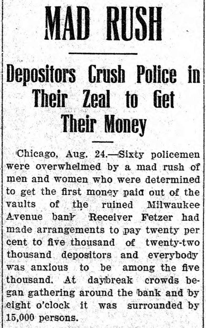 MAD RUSH Depositors Crush Police in Their Zeal to Get Their Money Chicago, Aug. 24.-Sixty policemen were overwhelmed by a mad rush of men and women who were determined to get the first money paid out of the vaults of the ruined Milwaukee Avenue bank Receiver Fetzer had made arrangements to pay twenty per cent to five thousand of twenty-two thousand depositors and everybody was anxious to be among the five thousand. At daybreak crowds began gathering around the bank and by eight o'clock it was surrounded by 15,000 persons.