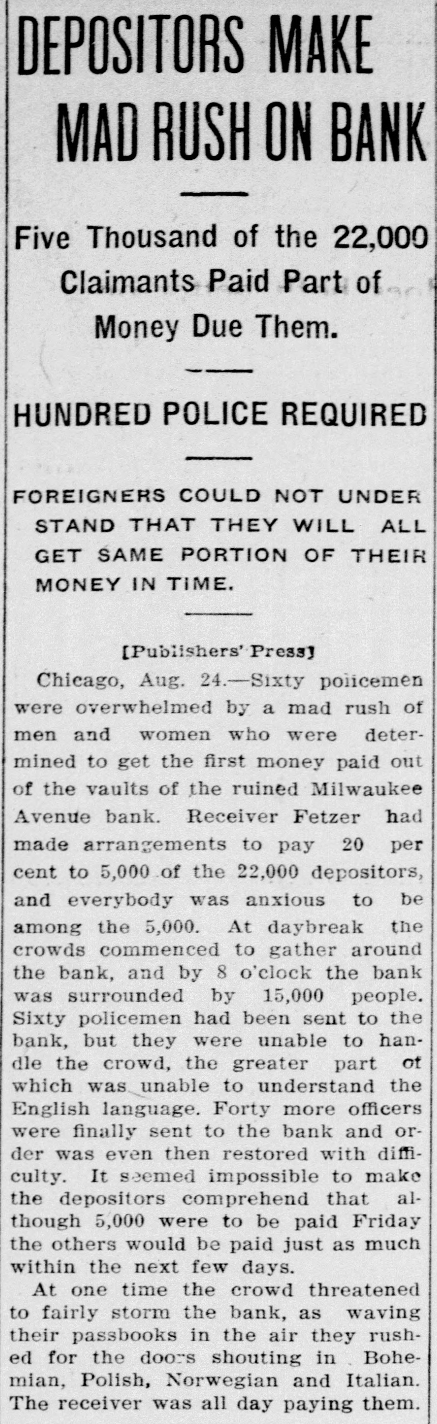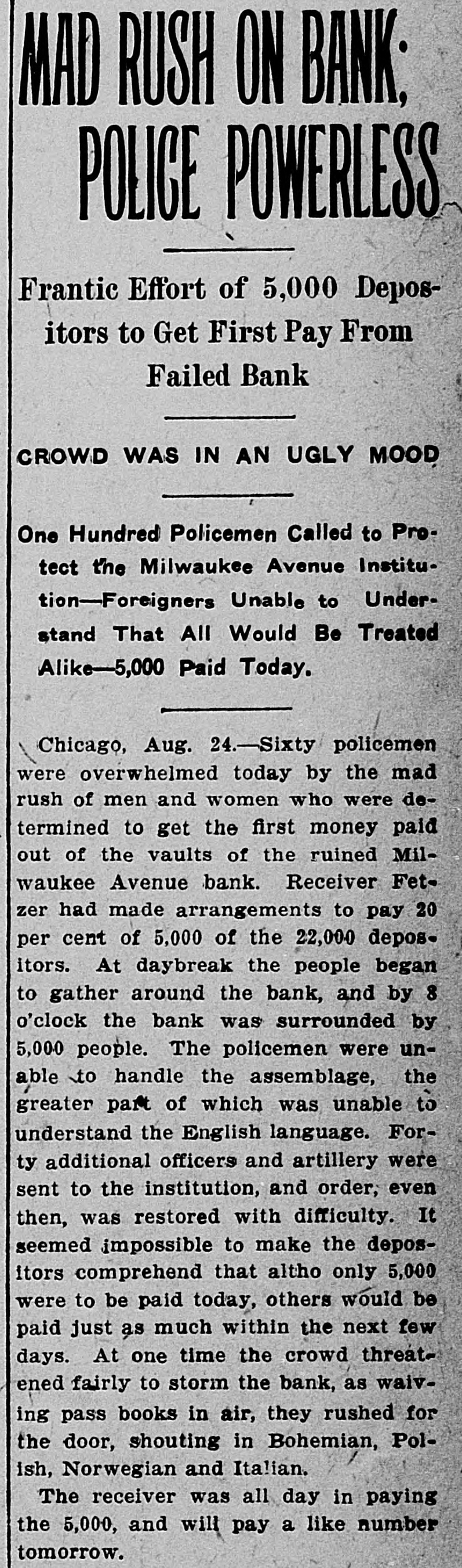 MAD RUSH ON BANK: POLICE POWERLESS Frantic Effort of 5,000 Depositors to Get First Pay From Failed Bank CROWD WAS IN AN UGLY MOOD One Hundred Policemen Called to Protect the Milwaukee Avenue Institution-Foreigners Unable to Understand That All Would Be Treated Alike-5,000 Paid Today. Chicago, Aug. 24.-Sixty policemen were overwhelmed today by the mad rush of men and women who were determined to get the first money paid out of the vaults of the ruined Milwaukee Avenue bank. Receiver Fetzer had made arrangements to pay 20 per cent of 5,000 of the 22,000 depositors. At daybreak the people began to gather around the bank, and by 8 o'clock the bank was surrounded by 5,000 people. The policemen were unable to handle the assemblage, the greater part of which was unable to understand the English language. Forty additional officers and artillery were sent to the institution, and order, even then, was restored with difficulty. It seemed impossible to make the depositors comprehend that altho only 5,000 were to be paid today, others would be paid just as much within the next few days. At one time the crowd threatened fairly to storm the bank, as waiving pass books in air, they rushed for the door, shouting in Bohemian, Polish, Norwegian and Italian. The receiver was all day in paying the 5,000, and will pay a like number tomorrow.