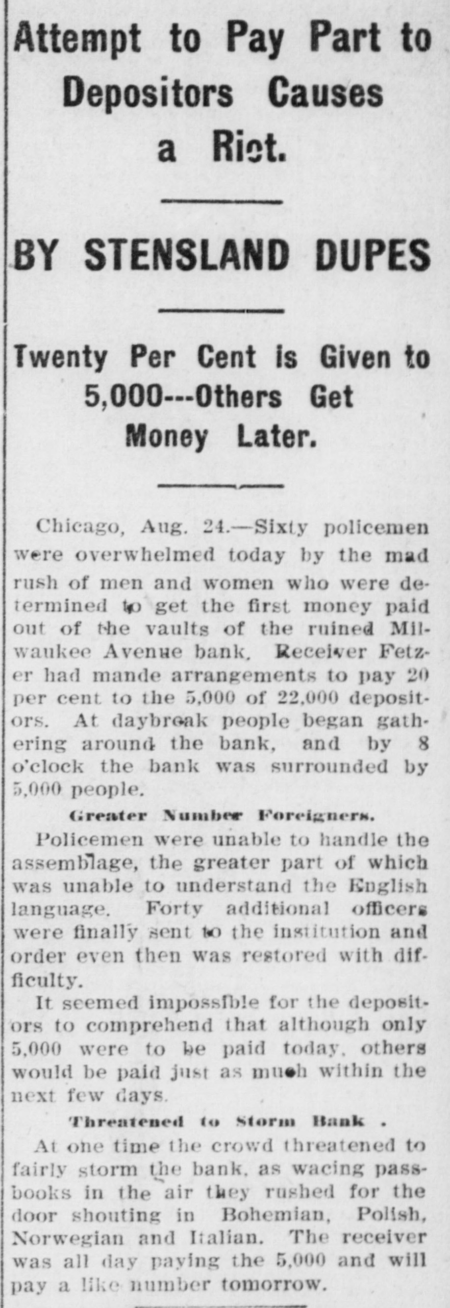 Attempt to Pay Part to Depositors Causes a Riet. BY STENSLAND DUPES Twenty Per Cent is Given to 5,000---Others Get Money Later. Chicago, Aug. 24.-Sixty policement were overwhelmed today by the mad rush of men and women who were determined to get the first money paid out of the vaults of the ruined Milwaukee Avenue bank. Receiver Fetzer had mande arrangements to pay 20 per cent to the 5,000 of 22,000 depositors. At daybroak people began gathering around the bank, and by 8 o'clock the bank was surrounded by 5,000 people. Greater Number Foreigners. Policemen were unable to handle the assemblage, the greater part of which was unable to understand the English language. Forty additional officers were finally sent to the institution and order even then was restored with difficulty. It seemed impossible for the depositors to comprehend that although only 5,000 were to be paid today. others would be paid just as much within the next few days. Threatened to Storm Bank . At one time the crowd threatened to fairly storm the bank. as wacing passbooks in the air they rushed for the door shouting in Bohemian, Polish, Norwegian and Italian. The receiver was all day paying the 5,000 and will pay a like number tomorrow.