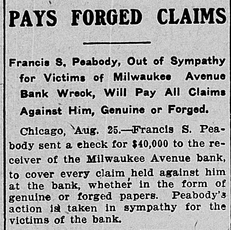 PAYS FORGED CLAIMS Francis S. Peabody, Out of Sympathy for Victims of Milwaukee Avenue Bank Wrock, Will Pay All Claims Against Him, Genuine or Forged. Chicago, Aug. 25.-Francis S. Peabody sent a check for $40,000 to the receiver of the Milwaukee Avenue bank, to cover every claim held against him at the bank, whether in the form of genuine or forged papers. Peabody's action ist taken in sympathy for the victims of the bank.
