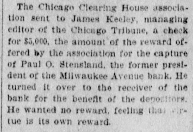 The Chicago Clearing House association sent to James Keeley, managing editor of the Chicago Tribune, a check for $5,000, the amount of the reward offered by the association for the capture of Paul O. Stensland, the former president of the Milwaukee Avenue bank. He turned it over to the receiver of the bank for the benefit of the depositors. He wanted no reward, feeling that virtue is its own reward.