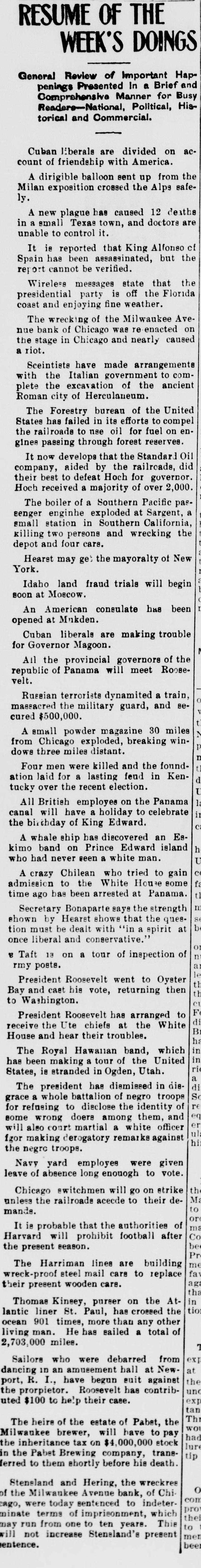 RESUME OF THE WEEK'S DOINGS General Review of Important Hap penings Presented In a Brief and Comprehensive Manner for Busy Readere-National Political, Historical and Commercial. Cuban liberals are divided on account of friendship with America. A dirigible balloon sent up from the Milan exposition crossed the Alps safely. A new plague has caused 12 deaths in a small Texas town, and doctors are unable to control it. It is reported that King Alfonso of Spain has been assagginated, but the report cannot be verified. Wireless messages state that the presidential party is off the Florida coast and enjoying fine weather. The wrecking of the Milwaukee Avenue bank of Chicago was re enacted on the stage in Chicago and nearly caused a riot. Sceintists have made arrangements with the Italian government to complete the excavation of the ancient Roman city of Herculaneum. The Forestry bureau of the United States has failed in its efforts to compel the railroads to nse oil for fuel on enginee passing through forest reserves. It now develops that the Standard Oil company, aided by the railroads, did their best to defeat Hoch for governor. Hoch received a majority of over 2,000. The boiler of a Southern Pacific passenger enginhe exploded at Sargent, a small station in Southern California, killing two persons and wrecking the depot and four cars. Hearst may ge: the mayoralty of New York. Idaho land fraud trials will begin soon at Moscow. An American consulate has been opened at Mukden. Cuban liberals are making trouble for Governor Magoon. All the provincial governors of the republic of Panama will meet Roosevelt. Russian terrorists dynamited a train, massacred the military guard, and secured $500,000. A small powder magazine 30 miles from Chicago exploded, breaking windows three miles distant. Four men were killed and the foundd ation laid for a lasting fend in Kentucky over the recent election. la All British employes on the Panama canal will have a holiday to celebrate ca the birthday of King Edward. A whale ship has diecovered an Esh kimo band on Prince Edward island U who had never seen a white man. c A crazy Chilean who tried to gain fa admission to the White House some time ago has been arrested at Panama. Secretary Bonaparte says the strength shown by Hearst shows that the quesb tion must be dealt with "in a spirit at once liberal and conservative.' 8 Taft 13 on a tour of inspection of rmy posts. President Roosevelt went to Oyster th th Bay and cast his vote, returning then to Washington. F President Roosevelt has arranged to di receive the Ute chiefe at the White Br House and hear their troublee. ha in The Royal Hawaiian band, which in has been making a tour of the United ri States, is stranded in Ogden, Utah. a di The president has diemissed in die So grace a whole battalion of negro troops re for refusing to disclose the identity of eq some wrong doers among them, and er will also court martial a white officer ula hi fgor making derogatory remarks against the negrc troops. Navy yard employee were given leave of absence long enough to vote. the Chicago ewitchmen will go on strike Ma unless the railroads acecde to their deto mande. or ma It ie probable that the authorities of Co Harvard will prohibit football after be the present season. Pr me The Harriman lines are building fav wreck-proof steel mail care to replace agá their present wooden care. tha in Thomas Kineey, pureer on the Attio lantic liner St. Paul, has crossed the ocean 901 times, more than any other living man. He has sailed a total of 2,703,000 miles. exp Sailors who were debarred from at dancing in an amueement hall at Newthe port, R. I., have begun euit against und the prorpietor. Roosevelt has contribexp uted $100 to help their case. tan Thr The heire of the estate of Pabet, the wo Milwaukee brewer, will have to pay had lure the inheritance tax on $4,000,000 stock tip in the Pabet Brewing company, transferred to them shortly before his death. Steneland and Hering, the wreckree o of the Milwaukee Avenue bank, of Chicom cago, were today sentenced to indeter. pro thei minate terms of imprisonment, which to may run from one to ten years. This men will not increase Steneland's present sentence. beer