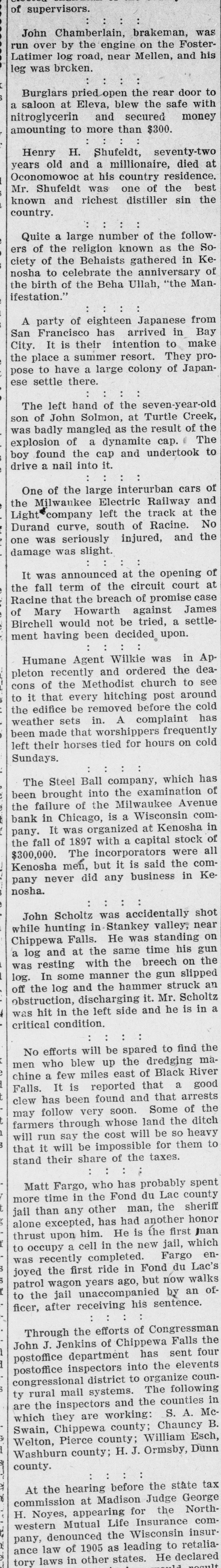 of supervisors. John Chamberlain, brakeman, was run over by the engine on the FosterLatimer log road, near Mellen, and his leg was brcken. Burglars pried open the rear door to a saloon at Eleva, blew the safe with nitroglycerin and secured money amounting to more than $300. Henry H. Shufeldt, seventy-two years old and a millionaire, died at Oconomowoc at his country residence. Mr. Shufeldt was one of the best known and richest distiller sin the country. Quite a large number of the followers of the religion known as the Society of the Behaists gathered in Keto celebrate the nosha anniversary "the Man- of the birth of the Beha Ullah, ifestation." A party of eighteen Japanese from has is their City. San Francisco It intention arrived They to in make pro- Bay the place a summer resort. pose to have a large colony of Japanese settle there. The left hand of the seven-year-old of John Solmon, at Turtle Creek, as the of a cap. was explosion son badly mangled dynamite result e of The the to boy found the cap and undertook drive a nail into it. One of the large interurban cars of the Milwaukee Electric Railway and Light company left the track at the Durand curve, south of Racine. No one was seriously injured, and the damage was slight. It was announced at the opening of of the Racine the breach of case the fall that term circuit against promise court James at of Mary Howarth Birchell would not be tried, a settlement having been decided upon. Humane Agent Wilkie was in Apand ordered the deathe Methodist hitching pleton cons to it that of recently every church post around to see be removed sets in. A the weather edifice complaint before the cold has been made that worshippers frequently left their horses tied for hours on cold Sundays. The Steel Ball company, which has been brought into the examination of the failure of the Milwaukee Avenue bank in Chicago, is a Wisconsin comIt was organized at of 1897 with a The were $300,000. pany. the fall incorporators capital Kenosha stock all in of Kenosha men, but it is said the company never did any business in Kenosha. John Scholtz was accidentally shot while hunting in Stankey valley, near Chippewa Falls. He was standing on and at the same time his gun with the on In some manner the gun a log. was log resting breech struck slipped the an off the log and the hammer obstruction, discharging it. Mr. Scholtz was hit in the left side and he is in a critical condition. No efforts will be spared to find the men who blew up the dredging machine a few miles east of Black River Falls. It is reported that a good clew has been found and that arrests follow very soon. Some of the whose the cost so farmers may will run through say will land be the heavy ditch that it will be impossible for them to stand their share of the taxes. Matt Fargo, who has probably spent more time in the Fond du Lac county jail than any other man, the sheriff alone excepted, has had another honor thrust upon him. He is the first man a cell in the new was to occupy recently completed. Fargo jail, which Lac's enthe first ride in Fond du years ago, to joyed patrol the wagon jail unaccompanied but now by an walks officer, after receiving his sentence. Through the efforts of Congressman John Jenkins of the postoffice J. department Chippewa has the sent Falls elevents four into district to mail systems. congressional postoffice rural inspectors organize The following counare and are which ty the they inspectors working: the Chauncy counties S. A. Mc- B. in Swain, Chippewa county; Welton, Pierce county; William Esch, Washburn county; H. J. Ormsby, Dunn county. At the hearing before the state tax at Madison H. for commission Noyes, appearing Judge the George NorthMutual Life Insurance comthe of 1905 as ance pany, western law denounced leading Wisconsin to declared retalia- insurtory laws in other states. He