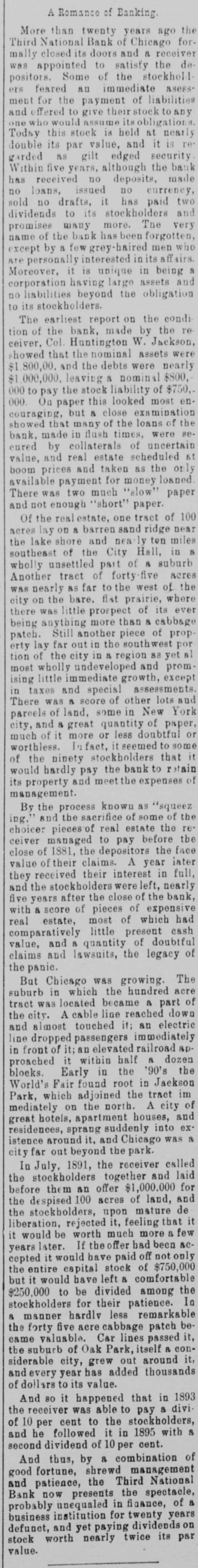 was appointed to satisfy the deSome of the an ers positors. feared immediate stockhold liabilities asessment for the payment of and offered to give any who would assume its their held stock obligations. to this stock is at nearly its value, and is as gilt double Today garded par edged security it re+ five no has Within received years, although deposits, currency, the made bank no loans, issued no sold no drafts, it has paid two dividends to its stockholders and promises many more. The very of the bank has been forgotten, a few men who except name by grey-haired are personally interested in its affairs. Moreover, it is unique in being corporation having large assets and no liabilities beyond the obligation to its stockholders. report on the bank, made re tion The of earliest by the the condi ceiver, Col. Huntington W. Jackson, that the were and the debts were showed $1,800,00. nominal assets nearly leaving & nominal $800, to the stock $750,. 000 $1,000,000. pay liability of On this looked most enbut & close that many of the the couraging, 000. showed paper examination loans of se. bank, made in flush times, were collaterals of and real estate at eured value, by scheduled uncertain and taken as only for money boom available prices payment "slow" the loaned paper There was two much enough "short" paper. Of the real estate, one tract of 100 acres lay on a barren sand ridge near the lake shore and nearly ten miles southeast of the City Hall, in 8 unsettled part of & tract of acres Another wholly forty-five suburb of the as far to the west the bare. flat city was nearly on prairie, of its where there was little prospect ever more than & Still another prop. patch. being anything piece southwest of cabbage far out in the por the city in a region as promerty tion most of lay wholly undeveloped and yet little immediate growth, except and special ising in taxes assessments. lots and There was & score of other of land, some in and 8 great quantity paper, parcels city, doubtful New of York of it more or less or In fact, it to some of much worthless. the ninety stockholders seemed that retain would hardly pay the bank to its property and meet the expenses of management. By the process known as "squeez ing,' and the sacrifice of some of the of real estate the re to pay the ceiver choicer managed pieces before the face close of 1881, the depositors of their claims. A year received their they value interest in inter full, stockholders left, nearly five after the close and years the of expensive the bank, with a score of pieces of real estate, most of which had comparatively little present cash value, and 8 quantity of doubtful claims and lawsuits, the legacy of panic. But Chicago was growing. The suburb in which the hundred acre tract was located became a part of A cable line touched it; an and the city. almost reached electric down line passengers immediately of it:an elevated apin front dropped railroad dozen proached it within half 8 in the '90's the Fair found root World's blocks. Early the in tract Jackson im which adjoined on the north. apartment great mediately Park, hotels, houses, A city and of sprang suddenly into exaround it. and was residences, istence Chicago park. city far out beyond the In July, 1891, the receiver called the stockholders together and laid them an offer $1,000.000 for 100 acres of and upon the the before despised stockholders, mature land, de rejected it, it be worth much more a it liberation, would feeling that few years later. If the offer had been &Cit would have paid capital stock of cepted the entire comfortable off $750,000 not only would have left & to be divided among $250,000 but it the In stockholders for their patience. hardly less the five acre cabbage 8 manner forty remarkable patch be. valuable. Car lines passed it, the of Oak Park, a congrew out siderable came suburb city, itself around it, and every year has added thousands of dollars to its value. And 80 it happened that in 1893 receiver was able to pay a of 10 cent to the & the per stockholders, with diviand he followed it in 1895 second dividend of 10 per cent. And thus, by & combination of shrewd and the Third good patience, fortune, management National Bank now presents the spectacle, probably unequaled in finance, of a institution for twenty years and yet paying worth nearly twice stock defunct, business dividends its par on value.