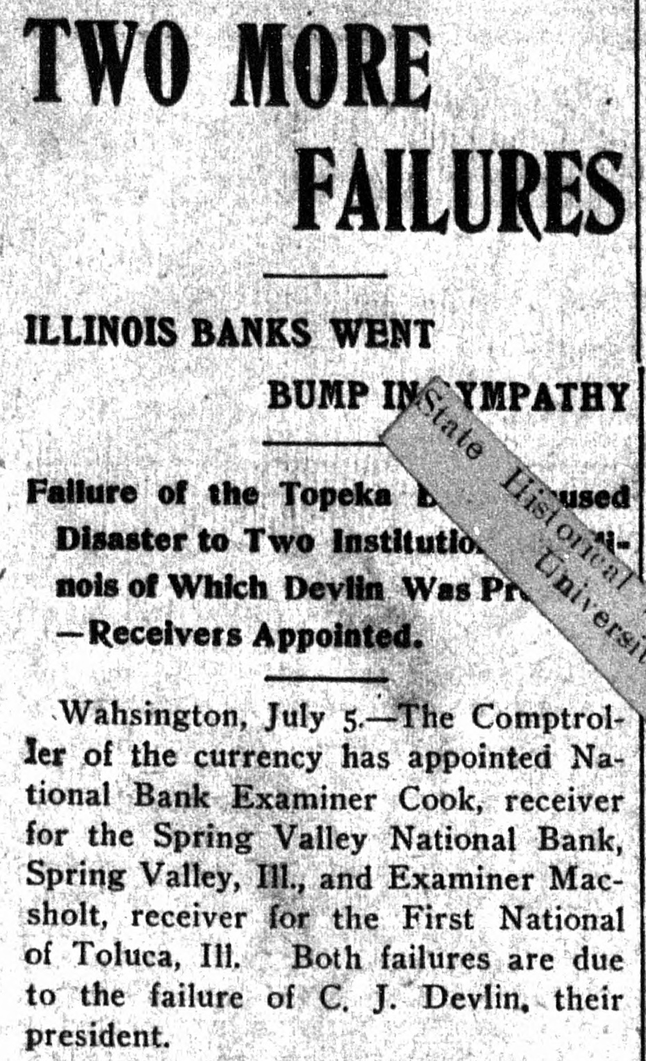 THE TOPEKA FAILURE Further Particulars Regarding Devlin's Financiering. PETITION FILED TODAY PETITIONING CREDITORS REPRESENT CLAIMS FOR $5,000. Runs on Other Banks Apparently Over -Receiver of First National Begun Work. TOPEKA, Kan., July 5.-A petition to declare C. J. Devlin a bankrupt was filed in the United States district court today in behalf of Kansas City creditors. The petition was filed upon behalf of Thomas Lightfoot, John A. Long and the Long Bros.' Grocery Company of Kansas City, Mo. The claims of the petitioning creditors aggregate $5,000. The effect of the action in bankruptcy will be to set aside the transfers of property which have*been made by Mr. Devlin recently, except the transfers of life insurance, which were made payable to Mrs. Devlin. The transfer of real estate to the First National Bank, which was made by Mr. Devlin on Monday following the closing of the bank, will be set aside, as will also the attachment of Devlin property made later at Kansas City by the National Bank of Commerce. As the real estate which Mr. Devlin transferred to the First National Bank here on Monday was valued at about $700,000, the action begun today on the part of the creditors will reduce the assets of the bank to just that extent. The petitioners represent that when Mr. Devlin assigned his property to the First National Bank of Topeka on July 3 he was then insolvent, and that such transfer was made with intent to make the failed bank a preferred creditor. The petition will prevent the running of further attachments on the Devlin property. It is made returnable on July 20. In the meantime Mr. Devlin may file a confession of bankruptcy or file an answer denying the acts of bankruptcy and ask for a trial by jury. The trustee in bankruptcy, who will be selected by the creditors, would have the power to take charge of the estate and after converting the assets into cash, apportion the proceeds equally among the creditors. When the First National Bank of Topeka, controlled by Devlin, falled on July 3, it was known that the Devlin estate owed both the Spring Valley National Bank of Spring Valley, Ill., and the First National Bank of Toluca, Ill., which closed their doors today, and the suspension of the latter institutions was expected to follow as a natural result. Runs on Bank Stopped. Just what amounts the Devlin estate owes to the two Illinois banks is not known, but it is stated that they became involved in loaning money to build the Toluca, Marquette and Northern railroad, a small coalcarrying road, which Mr. Devlin was constructing to his mining property in that state. This road connects with the Atchison, Topeka and Santa Fe, the Illinois Central, the Chicago, Milwaukee and St. Paul, the Chicago and Alton and the Indiana, Illinois and Iowa railroads. Negotiations are already in progress, it is said, to sell this railroad property, which is considered a valuable asset. PEORIA, Ill., July 5.--D. A. Cook, national bank examiner, who was appointed receiver of the Spring Valley National Bank of Spring Valley, Ill., refused to make a statement today as to the condition of the bank's finances or the amount owed the bank by the Devlin estate. There was no run on the institution when its doors were t closed. Runs on Topeka banks, which started on 1 Monday, following the failure of the First t National Bank, had apparently been stopped when the institutions opened for business today. A small crowd gathered about the First National Bank. but there was no e excitement. All banks from which depositors had withdrawn money on Moni day had further fortified themselves over i the holiday of yesterday, and at each bank s the officials stated that they were better 2 than ever able to meet all demands. e Receiver Bradly of the First National Bank began work today on the books of that concern. but no statement was avails able for publication regarding its condition and none was expected for some time : yet. C. S. Gleed and Clifford Histed, members of the creditors' committee, named at Kansas City, were in the city and held conferences with the bank officials in an en-