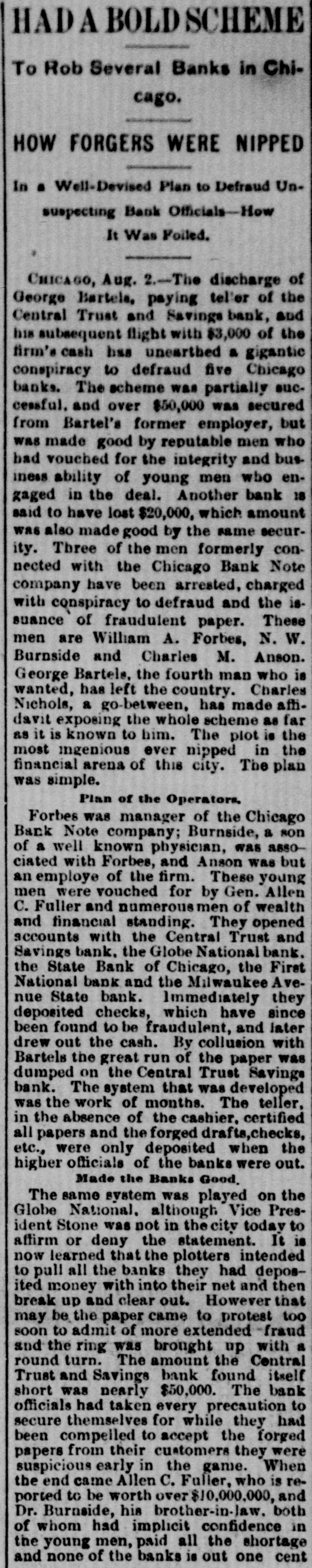 HAD A BOLD SCHEME To Rob Several Banks in Chicago. HOW FORGERS WERE NIPPED In a Well-Devised Plan to Defraud Un. suspecting Bank Officials-How It Was Foiled. CHICAGO, Aug. 2.-The discharge of George Bartela, paying teller of the Central Trust and Savings bank, and his subsequent flight with $3,000 of the firm's cash has unearthed a gigantic conspiracy to defraud five Chicago banks. The scheme was partially successful. and over $50,000 was secured from Bartel's former employer, but was made good by reputable men who had vouched for the integrity and business ability of young men who engaged in the deal. Another bank 18 said to have lost $20,000, which amount was also made good by the same security. Three of the men formerly connected with the Chicago Bank Note company have been arrested, charged with conspiracy to defraud and the issuance of fraudulent paper. These men are William A. Forbes, N. W. Burnside and Charles M. Anson. George Bartels, the fourth man who is wanted, has left the country. Charles Nichols, a go-between, has made affidavit exposing the whole scheme as far as it is known to him. The plot is the most ingenious ever nipped in the financial arena of this city. The plan was simple. Plan of the Operators. Forbes was manager of the Chicago Bank Note company; Burnside, a son of a well known physician, was associated with Forbes, and Anson was but an employe of the firm. These young men were vouched for by Gen. Allen C. Fuller and numerousmen of wealth and financial standing. They opened accounts with the Central Trust and Savings bank. the Globe National bank. First the State Bank of Chicago, the National bank and the Milwaukee Avenue State bank. Immediately they deposited checks, which have since been found to be fraudulent, and later drew out the cash. By collusion with Bartels the great run of the paper was dumped on the Central Trust Savinge bank. The system that was developed was the work of months. The teller, in the absence of the cashier. certified all papers and the forged drafts,checks, etc., were only deposited when the higher officials of the banks were out. Made the Banks Good. The same system was played on the Globe National. although Vice President Stone was not in the city today to affirm or deny the statement. It is now learned that the plotters intended to pull all the banks they had deposited money with into their net and then break up and clear out. However that may be the paper came to protest too soon to admit of more extended fro and the ring was brought up with a round turn. The amount the Central Trust and Savings bank found itself short was nearly $50,000. The bank had taken every precaution to for to accept from their customers early in game. secure officials been papers suspicious compelled themselves the while the they they forged When were had the end came Allen C. Fuller, who is reported to be worth over $10,000,000, and Dr. Burnside, his brother-in-law. both of whom had implicit confidence in the young men, paid all the shortage and none of the banks is out one cent