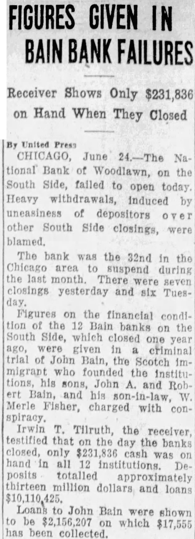 FIGURES GIVEN IN BAIN BANK FAILURES Receiver Shows Only $231,836 on Hand When They Closed United Press CHICAGO, June 24.-The Na. tional Bank of Woodlawn, on the South Side, failed to open today. Heavy withdrawals, induced by uneasiness of depositors over other South Side closings, were blamed. The bank was the 32nd in the Chicago area to suspend during the last month. There were seven closings yesterday and six Tuesday. Figures on the financial condition the 12 Bain banks on the South Side, which closed one year ago, were given in criminal trial of John Bain, the Scotch 1mmigrant who founded the institutions, his sons, John A. and Rob. ert Bain, and his son-in-law, W. Merle Fisher, charged with conspiracy. Irwin T. Tilruth, the receiver testified that on the day the banks closed, only $231,836 cash was on hand in all 12 institutions. Deposits totalled approximately thirteen million dollars and loans $10,110,425. Loans to John Bain were shown to be $2,156,207 on which $17,555 has been collected.