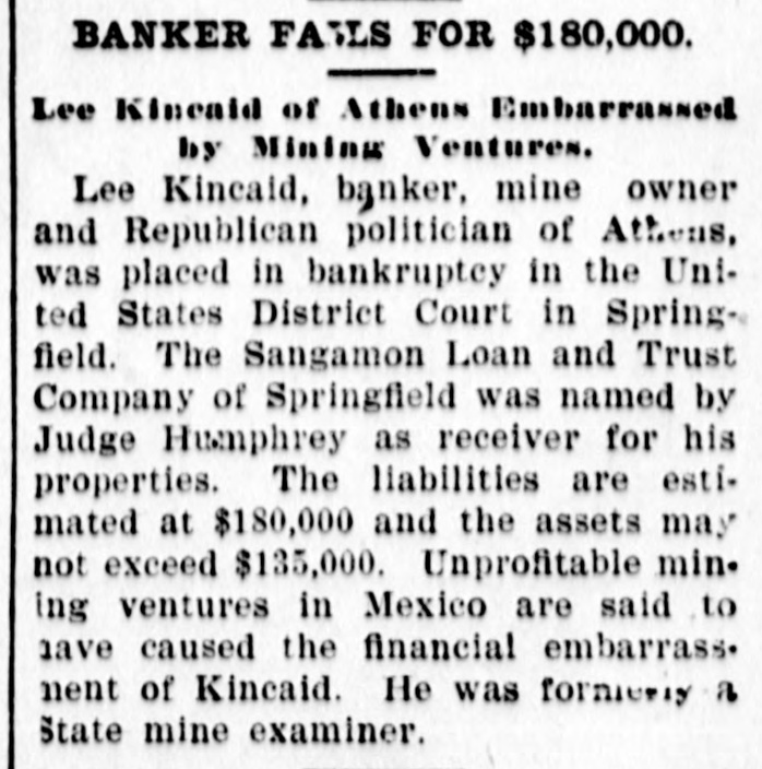 PROMINENT BANKER OF SPRINGFIELD FAILS By Leased Wire to The Tribune. SPRINGFIELD, May 7.-Lee Kaincaid, a well known Republican politician, private banker and coal mine operator, failed today. Creditors forced him into bankruptey, his liabilities being about $180,000 and assets $130,000. Mr. Kincaid's bank closed Friday night. His failure is due to accidents which occurred at his mine several years ago and to bad investments recently. The Sangomon Loan & Trust company was made receiver.