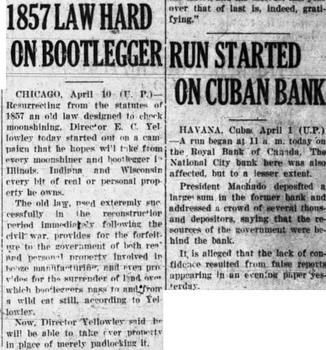 HARD ON BOOTLEGGER RUN STARTED ON CUBAN BANK CHICAGO. April 10 (U. Resurrecting from the statutes of 1857 an old law designed to check moonshining. Director E. C. Yel lowley today started out on cam paign that he hopes will take from every moonshiner and bootlegger Illinois Indiana and Wisconsin every bit of real or personal prop erty he owns. The old law, used exteremly sue cessfully in the reconstruction period immediately following the civil war. provides for the forfeit ure to the government of both res and personal property Involved in vides for the surrender of land 0501 which nass to and from wild eat still, according to Yel lowler. Now, Director Tellowley said will be able to take over property in place of merely padlocking it. run began at m. today on the Royal Bank of Canada. The National City bank here was also affected, but to lesser extent. President Machado deposited large sum in the former bank and addressed crowd of several thousand depositors, saying that the resources of the government were hind the bank. It, is alleged that the lack of confidence resulted from false reports appearing in an evening paper 'yesterday
