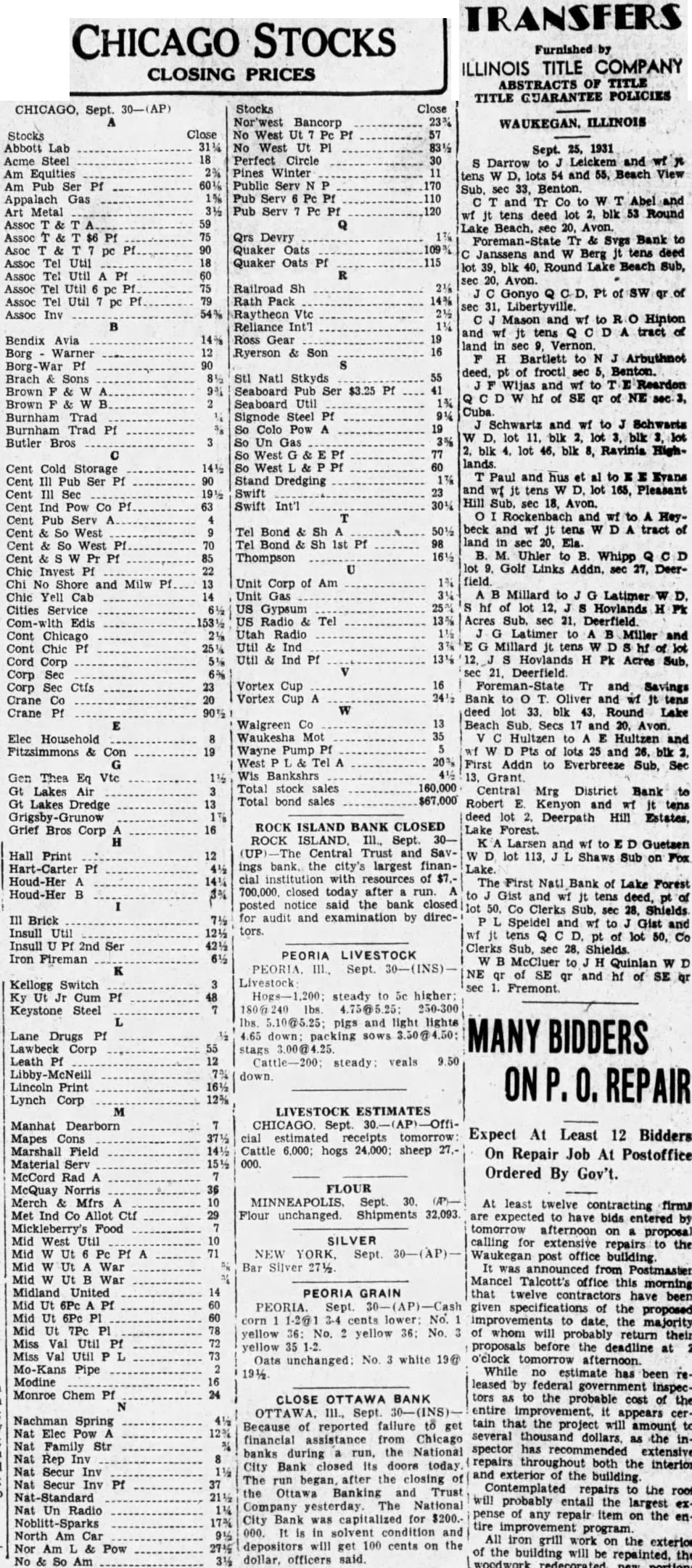 CHICAGO STOCKS CLOSING PRICES TRANSFERS Furnished ILLINOIS TITLE COMPANY ABSTRACTS TITLE TITLE GUARANTEE POLICIES ROCK ISLAND BANK CLOSED ROCK ISLAND. Ill., Sept. Central Trust Savings bank. largest financial resources 700,000 closed after posted notice the bank closed for audit and examination by direc- PEORIA LIVESTOCK III., Sept. Livestock steady to higher: 250-300 pigs and light lights 4.65 veals 9.50 down. M LIVESTOCK ESTIMATES CHICAGO. Sept. estimated receipts tomorrow Field Cattle 6,000; hogs 24,000; sheep WAUKEGAN. ILLINOIS Sept. 25, 1931 S Darrow Leickem and lots 54 55, Beach View Sub. sec 33, Benton. and Co W Abel and tens deed lot blk 53 Round Lake Avon. Bank to and Berg tens deed lot 39, blk Round Beach Sub, Avon. Gonyo Pt of SW sec Libertyville. Mason to Hinton and tract of in H Bartlett to Arbuthnot deed, pt froctl sec Benton. wf Reardon SE qr of NE Cuba Schwartz and wf to Schwarts 3% lot blk lot 46, blk Ravinia lands. Paul and hus to E Evans and tens 165, Pleasant sec Rockenbach and to Heybeck and wf tens tract sec Ela. Uhler Whipp Golf Links Addn, sec 27, Deer- FLOUR MINNEAPOLIS 30. Flour unchanged. Shipments 32,093 PEORIA GRAIN PEORIA. Sept. corn lower: No. yellow 36: No. yellow 36: No. yellow Oats unchanged: No white 19@ 19½ CLOSE OTTAWA BANK III., Sept. Because reported failure to get financial assistance from Chicago banks during the National City Bank closed doors today The run began, after the closing the Ottawa Banking and Trust Company yesterday. National City Bank was capitalized for $200.in solvent condition 2716 depositors will get 100 cents on the dollar. officers said. Sept. Stocks Close Nor'west Bancorp 23% Stocks Close No West Ut Pf Abbott Lab No West Ut Acme Steel 18 Perfect Circle Am Equities 2% Pines Winter Am Pub Pf Public Serv 170 Appalach Gas 1% Pub 110 Art Metal Pub Serv Pf 120 Assoc Q Assoc 75 Qrs Devry 1% Asoc Quaker Oats Assoc Util Quaker Oats Pf 115 Assoc Util R Assoc Tel Util Railroad Sh Assoc Tel Util Rath Pack Assoc Inv 54% Raytheon Vtc Reliance Int'l Bendix Avia 14% Ross Gear Warner Ryerson Son Brach Sons Stl Natl Stkyds 55 Brown Seaboard Pub Ser Brown Seaboard Burnham Trad Signode Steel Pf Burnham Trad Pf Pow Butler Bros 3 Un Gas Cent Cold Storage West Pf Cent Pub Ser Pf 90 Stand Dredging Swift Ind Pow 8 Pf Swift Int'l Cent Pub Serv Cent So West Tel Bond Sh Cent & So West Pf 1st Cent Pr Pf 85 Thompson Invest U Chic Chi No Shore and Milw Unit Corp of Am Unit Millard to Latimer W D. Chic Cab Cities Service Gypsum 25% lot 12, Hovlands H Pk Com-with Radio Tel 13% Acres Sub. sec 21, Deerfield. Chicago Utah Radio Latimer Miller 25% Ind Millard Cord Util Ind Pf 13% Hovlands H Pk Acres Corp Sec 21, Deerfield Ctfs 23 Vortex Cup Tr and Savings Crane Co Vortex Cup 24½ Oliver Pf W lot Round Lake Crane 90% E Walgreen Co 13 Beach and 20, Household Waukesha Mot 35 Hultzen Hultzen and Elec Fitzsimmons & Con 19 Wayne Pump Pf Pts of lots and 26, blk West Tel 20% First Addn to Everbreeze Sub, Sec Gen Thea Eq Vtc Wis Bankshrs Total stock sales 160,000 Gt Lakes Central Mrg District Bank Total sales $67,000 Gt Lakes Dredge Robert Kenyon deed Deerpath Hill Grief Bros Corp 16 Lake Forest. Larsen and wf to Guetsen Hall Print 12 lot 113, Shaws Sub on Fox Hart-Carter Pf Lake. Houd-Her The First Natl Bank of Lake Forest Houd-Her Gist wf tens deed, 50. Clerks sec 28, Shields Ill Brick Speidel and wf to Gist and Insull Util tens of lot 50, Insull 2nd Ser Clerks Sub, sec 28, Shields Fireman 6½ McCluer Quinlan W D K NE qr of SE qr and hf of SE or Kellogg Switch Fremont Ky Cum Pf 48 Keystone Steel Lane Drugs Pf MANY BIDDERS Lawbeck Corp Leath 12 Lincoln Print Lynch Corp 12% Manhat Dearborn Expect At Least 12 Bidders Mapes Cons Marshall On Repair Job At Postoffice Material Ordered By Gov't. McCord Rad McQuay Norris Merch Mfrs At least contracting firms Met Ind Co Allot Ctf 29 are bids entered Mickleberry's Food afternoon on proposal West Util 10 SILVER calling for extensive repairs to the Mid Pf A NEW Sept. Waukegan post office building. Bar It from War Mancel Talcott's office this morning Midland United 14 that twelve been given specifications the proposed 6Pc improvements to the majority 78 of whom will return Util Pf 72 proposals before the deadline at Miss Val Util 73 o'clock tomorrow Pipe While estimate has been released by federal inspecChem Pf tors as to the probable cost of the entire improvement. it appears cerSpring tain that the project will amount to 12% several thousand dollars. as the inStr spector has recommended extensive Inv repairs throughout both the interior Inv and exterior the building Inv Pf 37 repairs the roof will probably entail the largest exRadio any repair on the Noblitt-Sparks tire All iron the exterior Pow the building will repainted. the Am