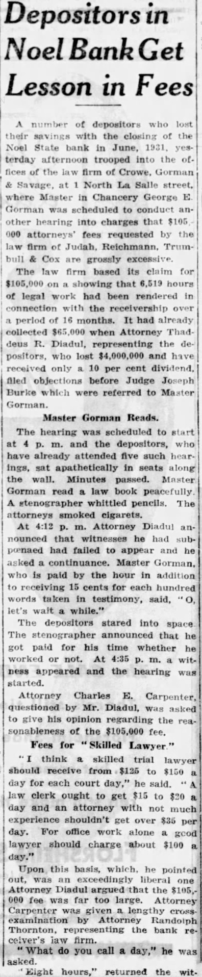 Receivers Reveal Conditions of Five More Closed Banks State Auditor Oscar Nelson yesterday made public the conditions of five more closed banks as disclosed by reports of receivers of the various banks. The reports constitute an accounting of the stewardship of each bank receiver and are being issued as they are compiled. George Wilson, receiver for the Commercial Trust and Savings bank, which closed May 28, listed total receipts of $464,792. He placed disbursements at $193,884, including $131,500 which he had to meet as bills payable. His itemized list of disbursements follows: Legal expenses 2,500 Clerical hire. 2,933 expense 2,246 Auditor's expense in closing bank. 975 Bills payable 181,500 Henry S Savage, receiver for the Noel State bank, closed June 18, listed total receipts of $912,954 and disbursements of $465,657. He listed total resources including $447 297 in cash on hand at $5,908,017. His itemized disbursements are as follows: Preferred claims paid $152,660 694 Receiver's salary and expenses. Clerical 7,043 1,683 Miscellaneous expense Auditor's expense in closing bank 2,370 297,068 Bills payable 4,076 Contra B2. 60 Contra B3 The Chicago Trust company, receiver for the Roosevelt Bankers State bank, closed Aug. 2, 1930, listed receipts of $151,569 and disbursements at $150,293. The company itemized reports of disbursements is as follows: Preferred claims paid $ 16,965 Receiver's salary and expenses 20,000 Leganl expenses 15,543 Clerical hire. 22,287 Miscellaneous 26,996 Auditor's in closing bank. 1,500 Bills payable paid. 47,000 George W. Reinecke, receiver for the Roseland State Savings bank. closed July 6, listed receipts of $395,296 and of $72,893. His itemized list of disbursements is as follows: Preferred claims paid 66,834 Clerical hire. 2,188 Miscellaneous expense 1,011 Auditor's expense in closing bank. 1,560 Insurance advanced 1,087 Arthur A. R. Nelson, receiver for the Twelfth Street State bank, closed June 29, listed receipts of and disbursements of $16,066. His itemized list of disbursements is as follows: Receiver's salary and expenses 256 Clerical 523 Miscellaneous expenses. 154 Audtior's closing bank..... 360 Bills payable paid. 14,792 All statements are dated Aug. 31. The statements issued yesterday with the seven released Tuesday cover 12 of the 67 closed banks in this area.