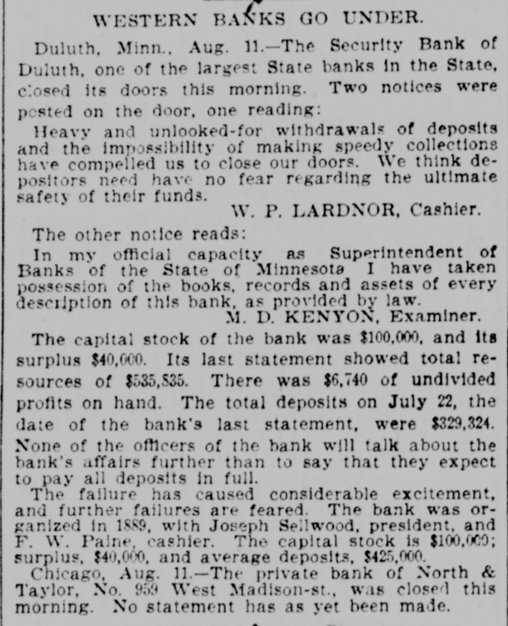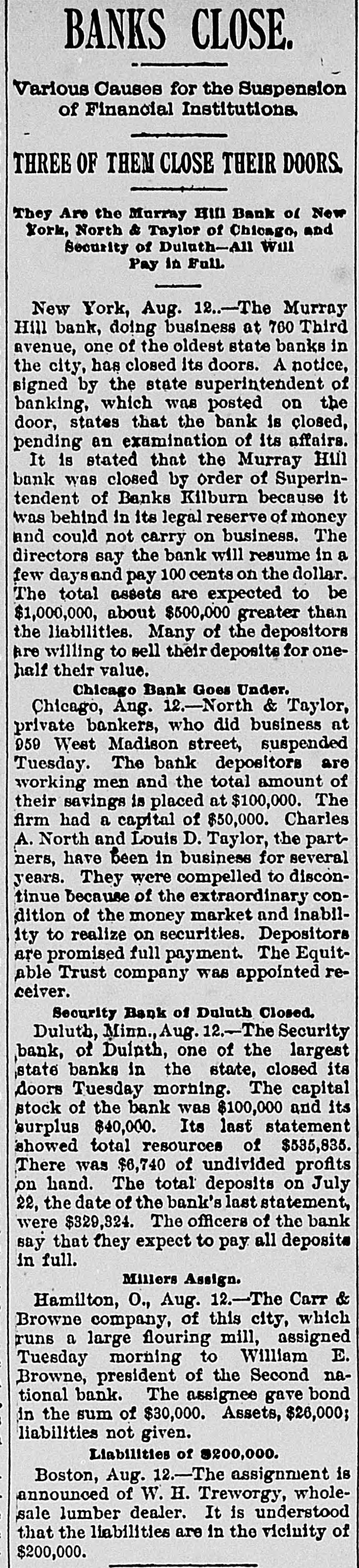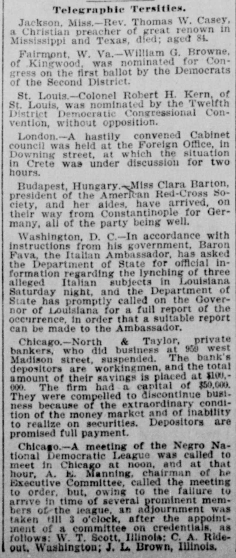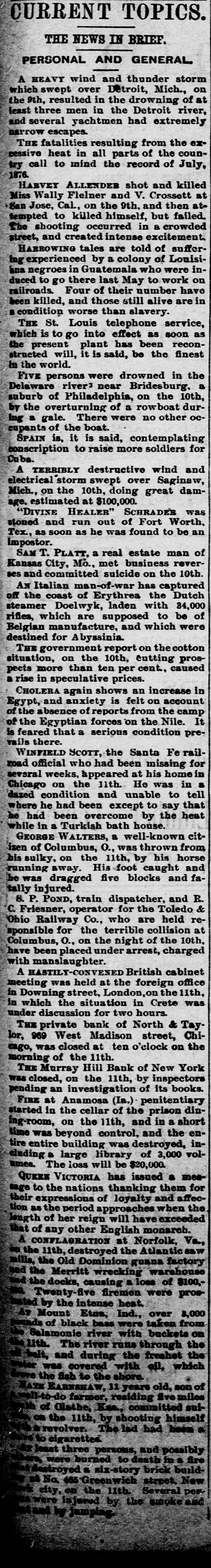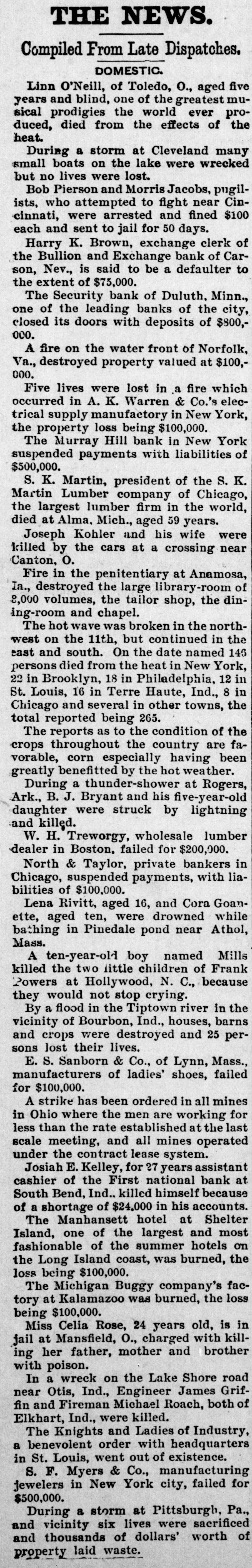 THE NEWS. Compiled From Late Dispatches. DOMESTIC. Linn O'Neill, of Toledo, O., aged five years and blind, one of the greatest musical prodigies the world ever produced, died from the effects of the heat. During a storm at Cleveland many small boats on the lake were wrecked but no lives were lost. Bob Pierson and Morris Jacobs, pugilists, who attempted to fight near Cincinnati, were arrested and fined $100 each and sent to jail for 50 days. Harry K. Brown, exchange clerk of the Bullion and Exchange bank of Carson, Nev., is said to be a defaulter to the extent of $75,000. The Security bank of Duluth, Minn., one of the leading banks of the city, closed its doors with deposits of $800,000. A fire on the water front of Norfolk, Va., destroyed property valued at $100,000. Five lives were lost in a fire which occurred in A. K. Warren & Co.'s electrical supply manufactory in New York, the property loss being $100,000. The Murray Hill bank in New York suspended payments with liabilities of $500,000. S. K. Martin, president of the S. K. Martin Lumber company of Chicago, the largest lumber firm in the world, died at Alma, Mich., aged 59 years. Joseph Kohler and his wife were killed by the cars at a crossing near Canton, O. Fire in the penitentiary at Anamosa, Ia., destroyed the large library-room of 8,000 volumes, the tailor shop, the dining-room and chapel. The hot wave was broken in the northwest on the 11th, but continued in the east and south. On the date named 146 persons died from the heat in New York, 22 in Brooklyn, 18 in Philadelphia, 12 in St. Louis, 16 in Terre Haute, Ind., 8 in Chicago and several in other towns, the total reported being 265. The reports as to the condition of the crops throughout the country are favorable, corn especially having been greatly benefitted by the hot weather. During a thunder-shower at Rogers, Ark., B. J. Bryant and his five-year-old daughter were struck by lightning and killed. W. H. Treworgy, wholesale lumber dealer in Boston, failed for $200,000. North & Taylor, private bankers in Chicago, suspended payments, with liabilities of $100,000. Lena Rivitt, aged 16, and Cora Goanette, aged ten, were drowned while bathing in Pinedale pond near Athol, Mass. A ten-year-old boy named Mills killed the two little children of Frank Powers at Hollywood, N. C., because they would not stop crying. By a flood in the Tiptown river in the vicinity of Bourbon, Ind., houses, barns and crops were destroyed and 25 persons lost their lives. E. S. Sanborn & Co., of Lynn, Mass., manufacturers of ladies' shoes, failed for $100,000. A strike has been ordered in all mines in Ohio where the men are working for less than the rate established at the last scale meeting, and all mines operated under the contract lease system. Josiah E. Kelley, for 27 years assistant cashier of the First national bank at South Bend, Ind.. killed himself because of a shortage of $24.000 in his accounts. The Manhansett hotel at Shelter Island, one of the largest and most fashionable of the summer hotels on the Long Island coast, was burned, the loss being $100,000. The Michigan Buggy company's factory at Kalamazoo was burned, the loss being $100,000. Miss Celia Rose, 24 years old, is in jail at Mansfield, O., charged with killing her father, mother and brother with poison. In a wreck on the Lake Shore road near Otis, Ind., Engineer James Griffin and Fireman Michael Roach, both of Elkhart, Ind., were killed. The Knights and Ladies of Industry, a benevolent order with headquarters in St. Louis, went out of existence. S. F. Myers & Co., manufacturing jewelers in New York city, failed for $500,000. During a storm at Pittsburgh, Pa., and vicinity six lives were sacrificed and thousands of dollars' worth of property laid waste.