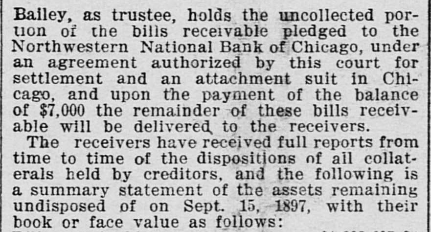 Bailey, as trustee, holds the uncollected portion of the bills receivable pledged to the Northwestern National Bank of Chicago, under an agreement authorized by this court for settlement and an attachment suit in Chicago, and upon the payment of the balance of $7,000 the remainder of these bills receivable will be delivered to the receivers. The receivers have received full reports from time to time of the dispositions of all collaterals held by creditors, and the following is a summary statement of the assets remaining undisposed of on Sept. 15, 1897, with their book or face value as follows: