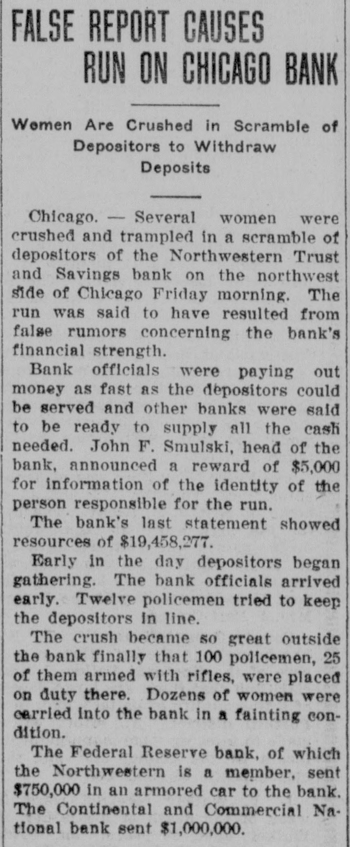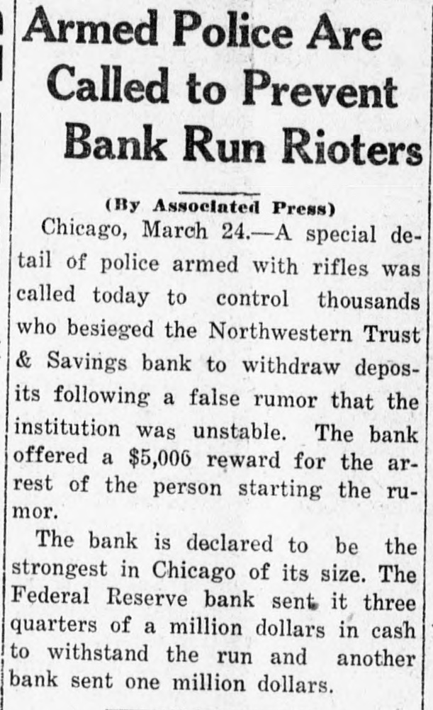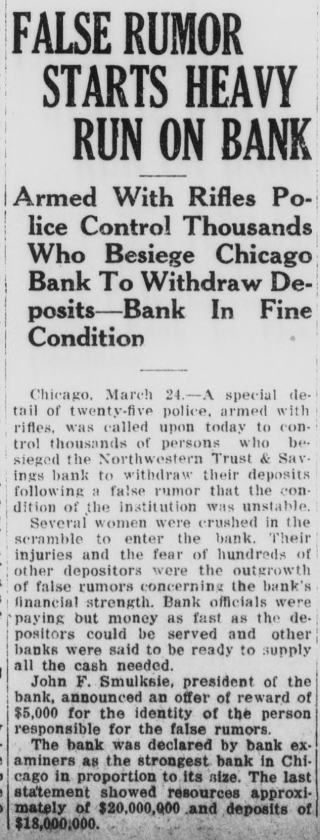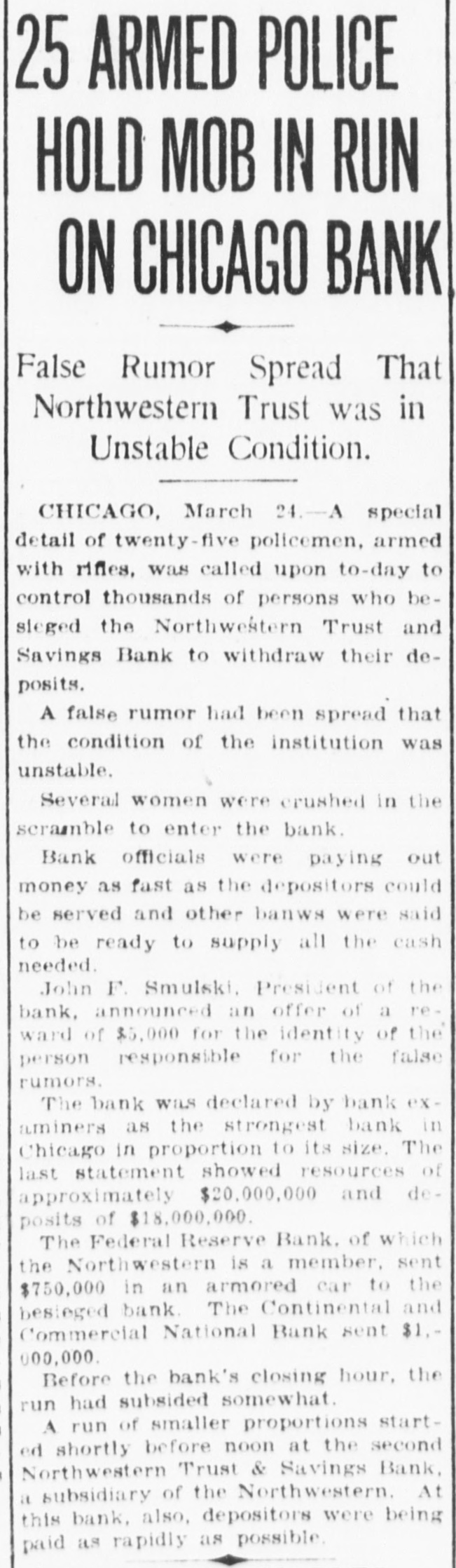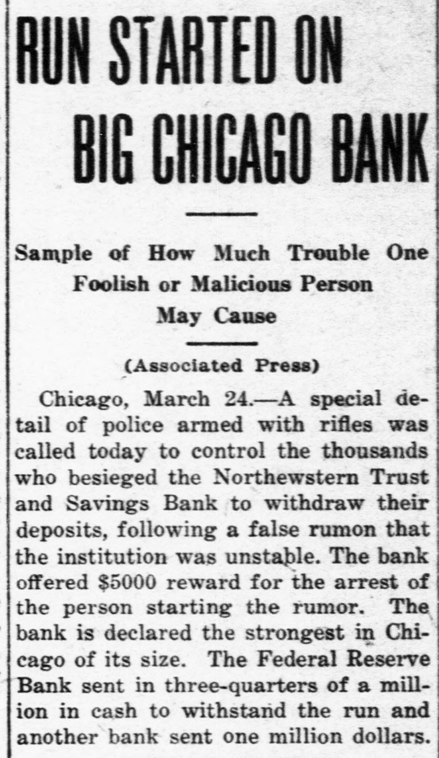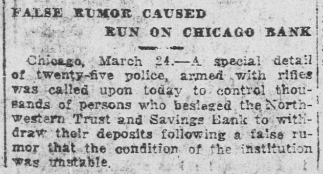 RUN STARTED ON BIG CHICAGO BANK Sample of How Much Trouble One Foolish or Malicious Person May Cause (Associated Press) Chicago, March 24.-A special detail of police armed with rifles was called today to control the thousands who besieged the Northewstern Trust and Savings Bank to withdraw their deposits, following a false rumon that the institution was unstable. The bank offered $5000 reward for the arrest of the person starting the rumor. The bank is declared the strongest in Chicago of its size. The Federal Reserve Bank sent in three-quarters of a million in cash to withstand the run and another bank sent one million dollars.