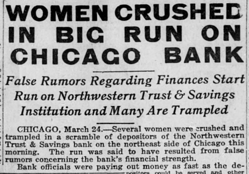 WOMEN CRUSHED IN BIG RUN ON CHICAGO BANK False Rumors Regarding Finances Start Run on Northwestern Trust & Savings Institution and Many Are Trampled CHICAGO, March 24.-Several women were crushed and trampled in a scramble of depositors of the Northwestern Trust & Savings bank on the northeast side of Chicago this morning. The run was said to have resulted from false rumors concerning the bank's financial strength. Bank officials were paying out money as fast as the depositors could be served and other