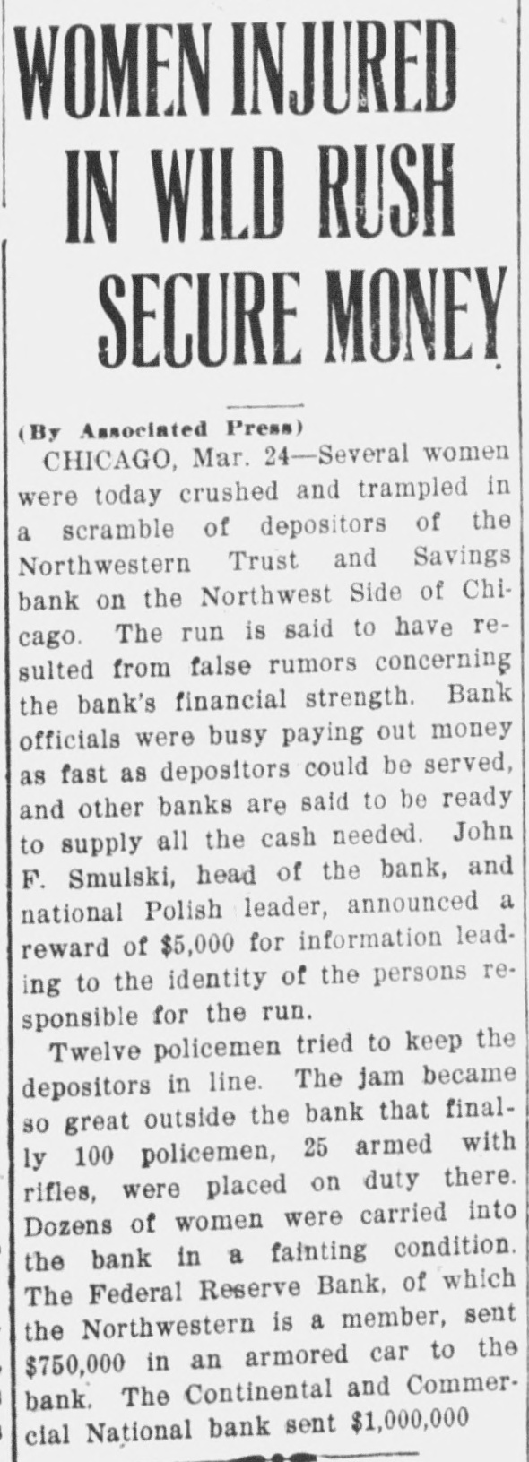 WOMEN INJURED IN WILD RUSH SECURE MONEY (By Associated Press) CHICAGO, Mar. 24-Several women were today crushed and trampled in a scramble of depositors of the Northwestern Trust and Savings bank on the Northwest Side of Chicago. The run is said to have resulted from false rumors concerning the bank's financial strength. Bank officials were busy paying out money as fast as depositors could be served, and other banks are said to be ready to supply all the cash needed. John F. Smulski, head of the bank, and national Polish leader, announced a reward of $5,000 for information leading to the identity of the persons responsible for the run. Twelve policement tried to keep the depositors in line. The jam became so great outside the bank that finally 100 policemen, 25 armed with rifles, were placed on duty there. Dozens of women were carried into the bank in a fainting condition. The Federal Reserve Bank, of which the Northwestern is a member, sent $750,000 in an armored car to the bank. The Continental and Commercial National bank sent $1,000,000