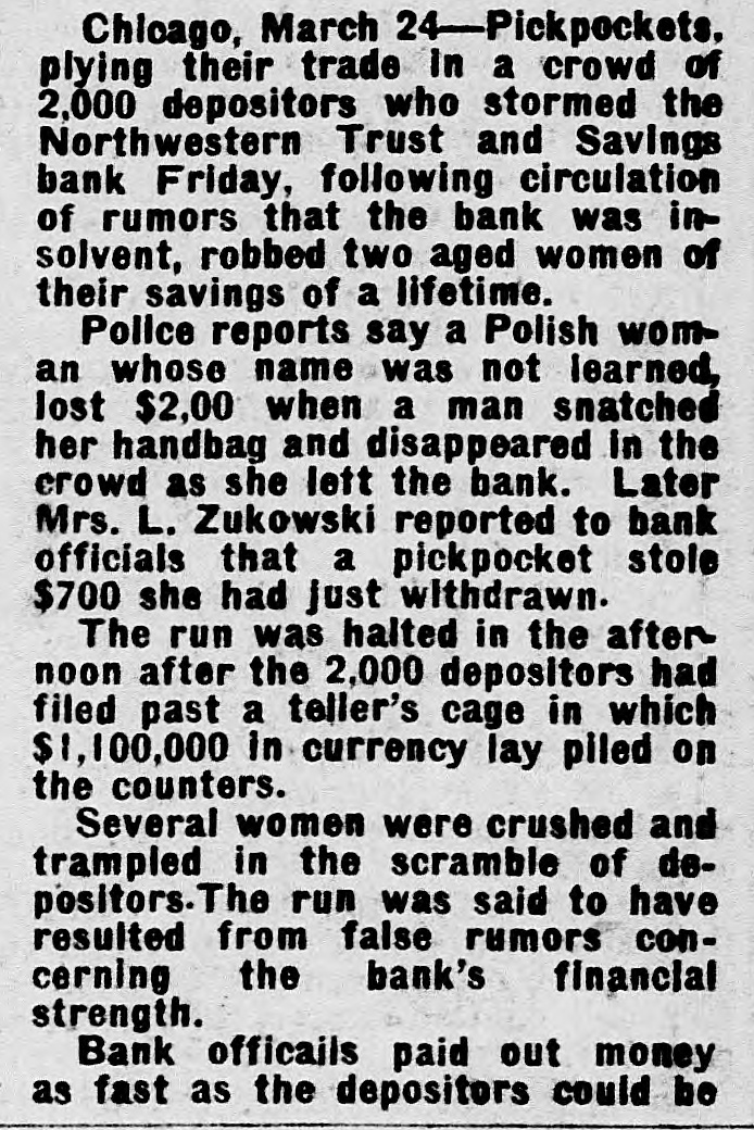 Chicago, March 24-Pickpockets, plying their trade in a crowd of 2,000 depositors who stormed the Northwestern Trust and Savings bank Friday, following circulation of rumors that the bank was insolvent, robbed two aged women of their savings of a lifetime. Police reports say a Polish woman whose name was not learned. lost $2,00 when a man snatched her handbag and disappeared in the crowd as she left the bank. Later Mrs. L. Zukowski reported to bank officials that a pickpocket stole $700 she had just withdrawn. The run was halted in the after noon after the 2,000 depositors had filed past a teller's cage in which $1,100,000 in currency lay piled on the counters. Several women were crushed and trampled in the scramble of depositors. The run was said to have resulted from false rumors concerning the bank's financial strength. Bank officails paid out money as fast as the depositors could be