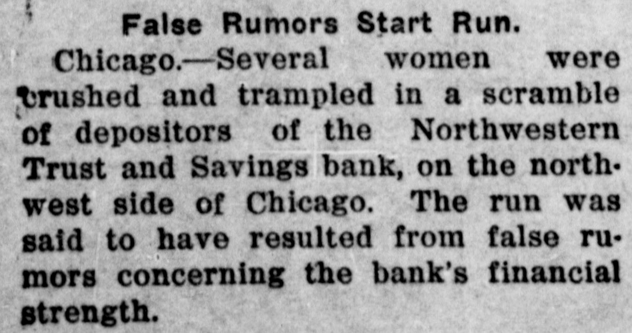 False Rumors Start Run. Chicago.-Several women were crushed and trampled in a scramble of depositors of the Northwestern Trust and Savings bank, on the north. west side of Chicago. The run was said to have resulted from false rumors concerning the bank's financial strength.