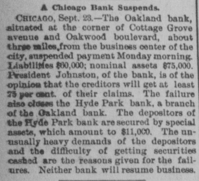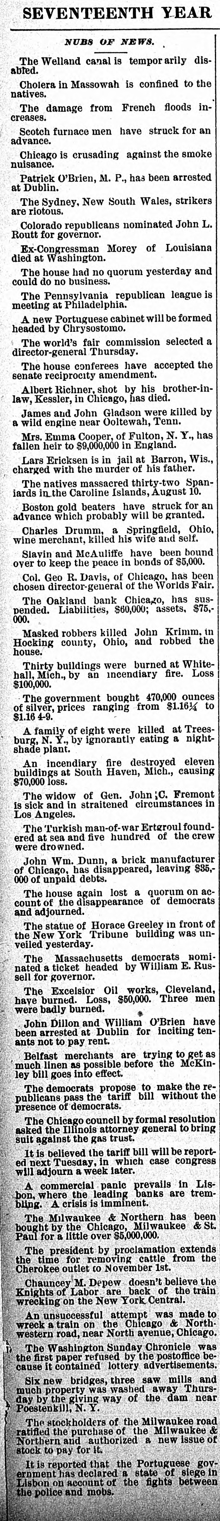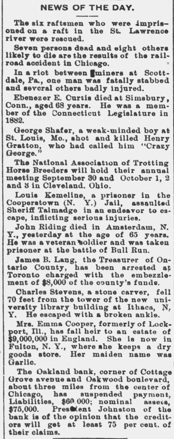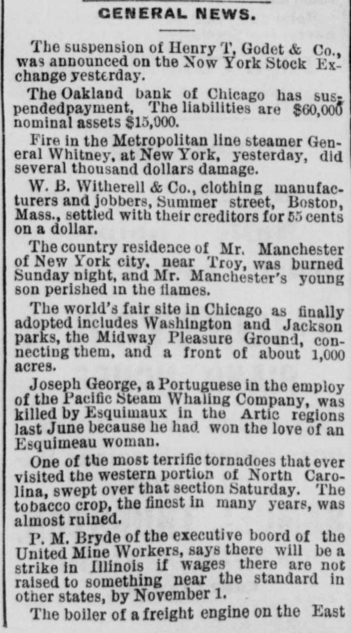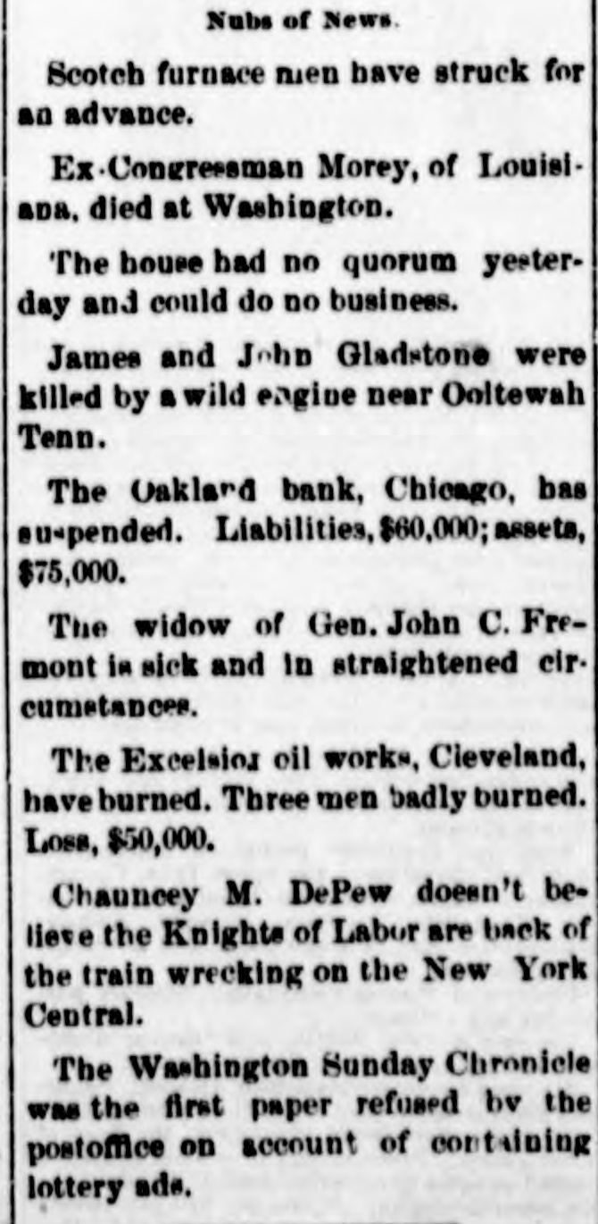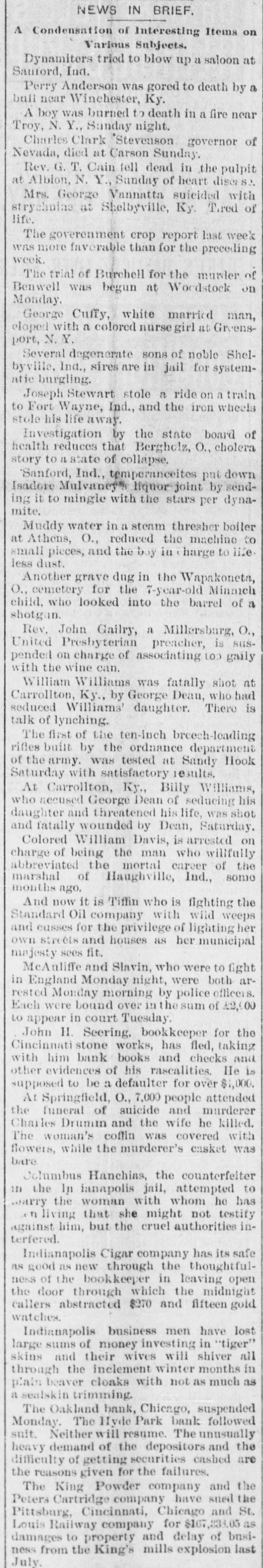 NEWS TN BRIEF. A Condensation of Interesting Items on Various Subjects. Dynamiters triod to blow up a saloon at Sauford, Ind. Perry Anderson was gored to death by a ball near Winchester, Ky. A boy was burned to death in a fire near Troy, N. Y., Sunday night. Charles Clark "Stevenson governor of Nevada, died at Carson Sunday. Rev. G. T. Cain tell dead in the pulpit at Albion, N. Y., Sunday of heart disease Mrs. George Vannatta suicided with strychnine at Shelbyville, Ky. Tired of life. The goverenment crop report last week was more faverable than for the preceding week. The trial of Burchell for the murder of Benwell was bégun at Wordstock on Monday. George Cuffy, white married man, eloped with a colored nurse girl at Greensport, N. Y. Several degenerate sons of noble Shelbyville, Ind., sires are in jail for systematic burgling. Joseph Stewart stole a ride on a train to Fort Wayne, Ind., and the iron wheels stole his life away. Investigation by the state board of health reduces that Bergholz, O., cholera story to a state of collapse. Sanford, Ind., temperanceites put down Isadore Mulvaney liquor-joint by sending it to mingle with the stars per dynamite. Muddy water in a steam thresher boiler at Athens, O., reduced the machine to small pieces, and the boy in harge to life less dust. Another grave dug in the Wapakoneta, O., cemetery for the 7-year-old Minnich child, who looked into the barrel of a shotgan. Rev. John Gailry, a Millersburg, O., United Presbyterian preacher, is suspended on charge of associating 100 gaily with the wine can. William Williams was fatally shot at Carrollton, Ky., by George Dean, who had seduced Williams' daughter. There is talk of lynching. The first of the ten-inch breech-leading rifles built by the ordnance department of the army. was tested at Sandy Hook Saturday with satisfactory results. At Carrollton, Ky., Billy Williams, who accused George Dean of seducing his daughter and threatened his life, was shot and fatally wounded by Dean, Saturday. Colored William Davis, is arrested on charge of being the man who willfully abbreviated the mortal career of the marshal of Haughville, Ind., somo months ago. And now it is Tiffin who is fighting the Standard Oil company with wild weeps and cusses for the privilege of lighting her own streets and houses as her municipal majesty sees fit. McAuliffe and Slavin, who were to fight in England Monday night, were both arrested Monday morning by police officers. Each were bound over in the sum of £2,000 to appear in court Tuesday. John H. Seering. bookkeeper for the Cincinnati stone works, has fled, taking with him bank books and checks and other evidences of his rascalities. He is supposed to be a defaulter for over $1,000. At Springfield, O., 7,000 people attended the funeral of suicide and murderer Charles Drumm and the wife he killed. The woman's coffin was covered with flowers, while the murderer's casket was bare Columbus Hanchias, the counterfeiter in the In ianapolis jail, attempted to courty the woman with whom he has en living that she might not testify against him, but the cruel authorities interfered. Indianapolis Cigar company has its safe as good as new through the thoughtfulness of the bookkeeper in leaving open the door through which the midnight callers abstracted $270 and fifteen gold watches. Indianapolis business men have lost large sums of money investing in "tiger" skins and their wives will shiver all through the inclement winter months in plain beaver cloaks with not as much as a sealskin trimming. The Oakland bank, Chicago, suspended Monday. The Hyde Park bank followed suit. Neither will resume. The unusually heavy demand of the depositors and the difficulty of getting securities cashed are the reasons given for the failures. The King Powder company and the Peters Cartridge company have sued the Pittsburg, Cincinnati, Chicago and St. Louis Railway company for $167,833.05 as damages to property and delay of business from the King's mills explosion last July.