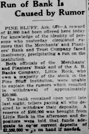 Run of Bank Is Caused by Rumor reward PINE BLUFF. of the identity for sons and Plant mors the Trust faced and precipitating run on the insolvency, institution. of the Both Bank and the Little who Banks Company, the stock the were unable Bluff rumors which resulted withdrawal approximately bank remained until The tellers paying all who delast night, to withdraw deposits. sired brought reserve Little Rock the told that funds adepositors deposits hand needed
