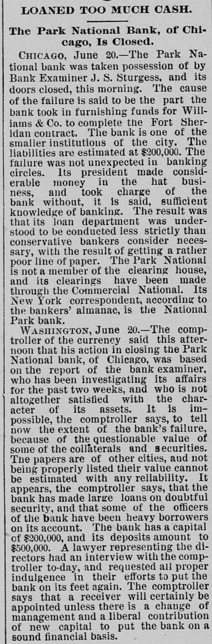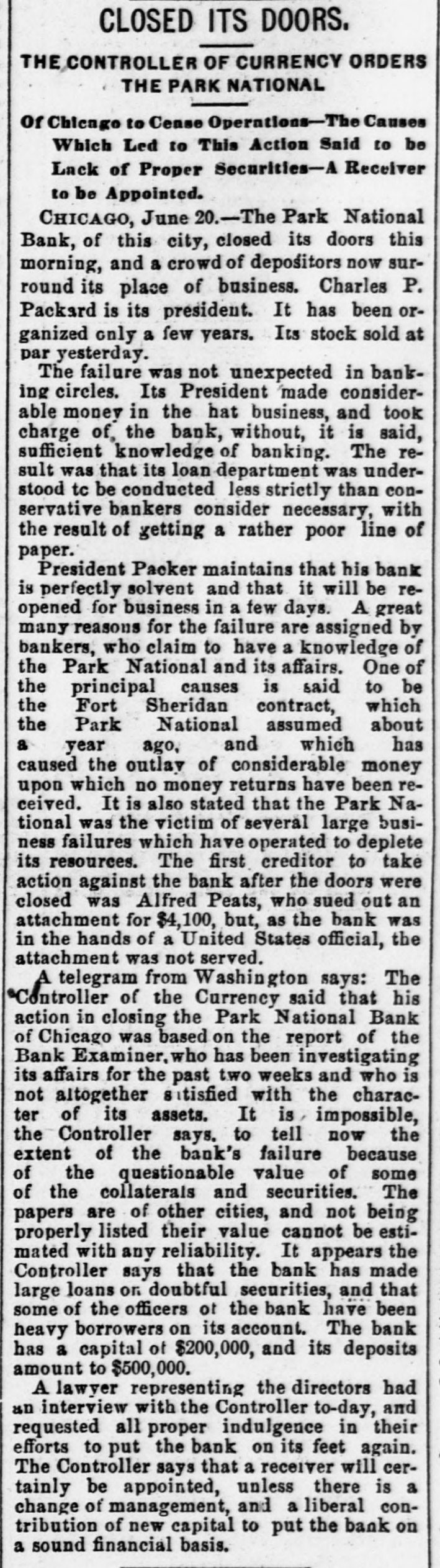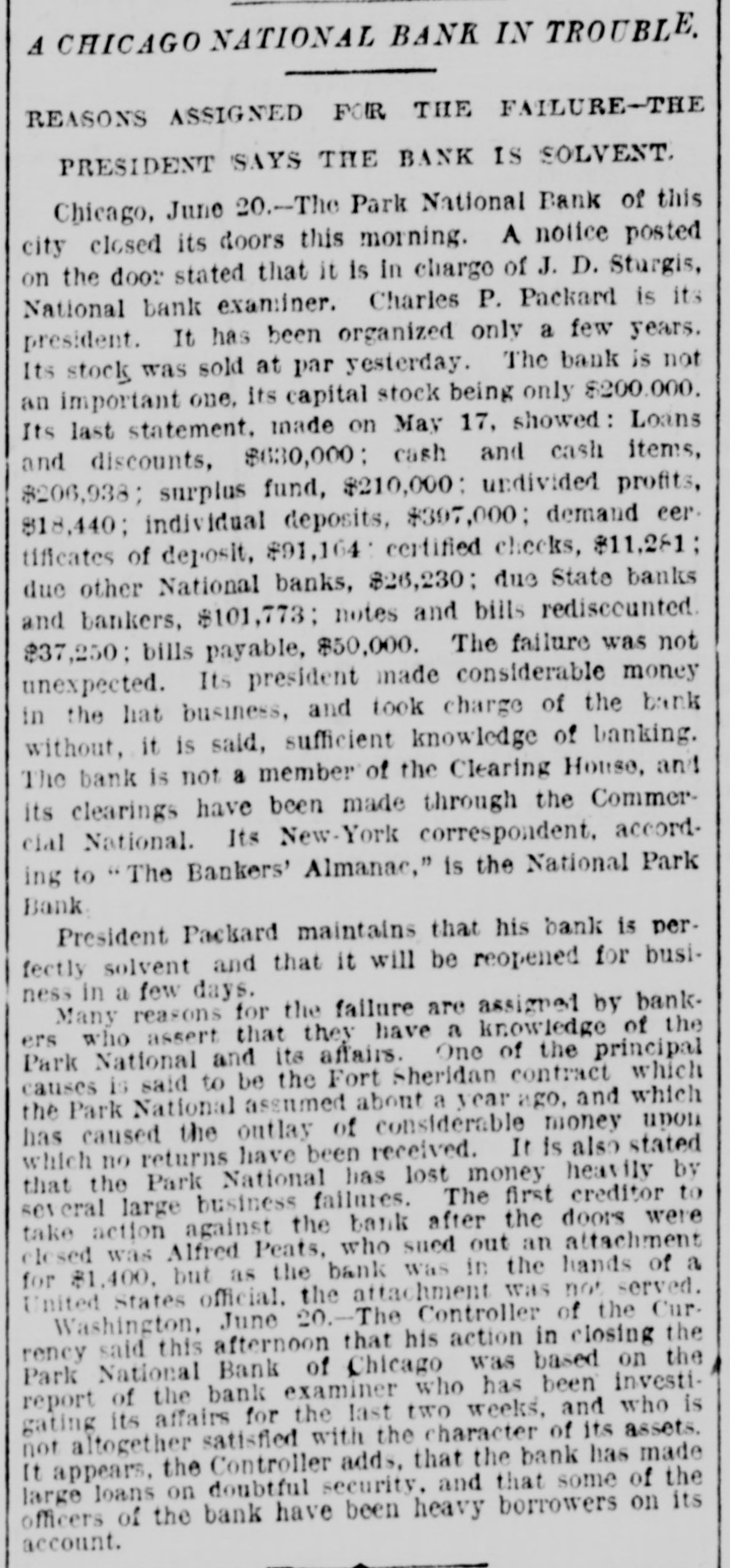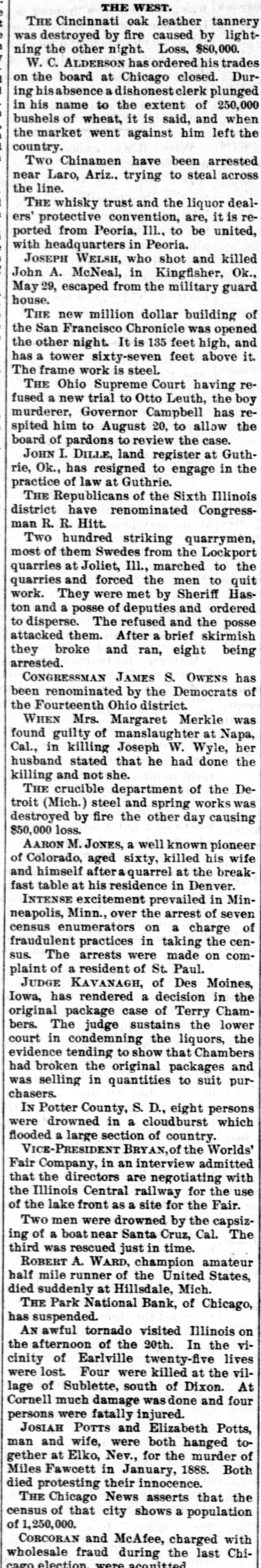 THE WEST. THE Cincinnati oak leather tannery was destroyed by fire caused by lightning the other night. Loss, $80,000. W. C. ALDERSON has ordered his trades on the board at Chicago closed. During absence a dishonest clerk plunged in his name to the extent of 250,000 bushels of wheat, it is said, and when the market went against him left the country. Two Chinamen have been arrested near Laro, Ariz., trying to steal across the line. THE whisky trust and the liquor dealers' protective convention, are, it is reported from Peoria, Ill., to be united, with headquarters in Peoria. JOSEPH WELSH, who shot and killed John A. McNeal, in Kingfisher, Ok., May 29, escaped from the military guard house. THE new million dollar building of the San Francisco Chronicle was opened the other night. It is 135 feet high, and has a tower sixty-seven feet above it. The frame work is steel. THE Ohio Supreme Court having refused a new trial to Otto Leuth, the boy murderer, Governor Campbell has respited him to August 20, to allow the board of pardons to review the case. JOHN I. DILLE, land register at Guthrie, Ok., has resigned to engage in the practice of law at Guthrie. THE Republicans of the Sixth Illinois district have renominated Congressman R. R. Hitt. Two hundred striking quarrymen, most of them Swedes from the Lockport quarries at Joliet, Ill., marched to the quarries and forced the men to quit work. They were met by Sheriff Haston and a posse of deputies and ordered to disperse. The refused and the posse attacked them. After a brief skirmish they broke and ran, eight being arrested. CONGRESSMAN JAMES S. OWENS has been renominated by the Democrats of the Fourteenth Ohio district. WHEN Mrs. Margaret Merkle was found guilty of manslaughter at Napa, Cal., in killing Joseph W. Wyle, her husband stated that he had done the killing and not she. THE crucible department of the Detroit (Mich.) steel and spring works was destroyed by fire the other day causing $50,000 loss. AARON M. JONES, a well known pioneer of Colorado, aged sixty, killed his wife and himself aftera quarrel at the breakfast table at his residence in Denver. INTENSE excitement prevailed in Minneapolis, Minn., over the arrest of seven census enumerators on a charge of fraudulent practices in taking the census. The arrests were made on complaint of a resident of St. Paul. JUDGE KAVANAGH, of Des Moines, Iowa, has rendered a decision in the original package case of Terry Chambers. The judge sustains the lower court in condemning the liquors, the evidence tending to show that Chambers had broken the original packages and was selling in quantities to suit purchasers. IN Potter County, S. D., eight persons were drowned in a cloudburst which flooded a large section of country. VICE-PRESIDENT BRYAN,Of the Worlds' Fair Company, in an interview admitted that the directors are negotiating with the Illinois Central railway for the use of the lake front as a site for the Fair. Two men were drowned by the capsizing of a boat near Santa Cruz, Cal. The third was rescued just in time. ROBERT A. WARD, champion amateur half mile runner of the United States, died suddenly at Hillsdale, Mich. THE Park National Bank, of Chicago, has suspended. AN awful tornado visited Illinois on the afternoon of the 20th. In the vicinity of Earlville twenty-five lives were lost. Four were killed at the village of Sublette, south of Dixon. At Cornell much damage was done and four persons were fatally injured. JOSIAH POTTS and Elizabeth Potts, man and wife, were both hanged together at Elko, Nev., for the murder of Miles Fawcett in January, 1888. Both died protesting their innocence. THE Chicago News asserts that the census of that city shows a population of 1,250,000. CORCORAN and McAfee. charged with