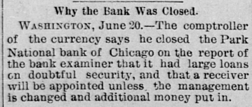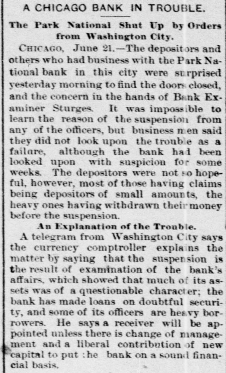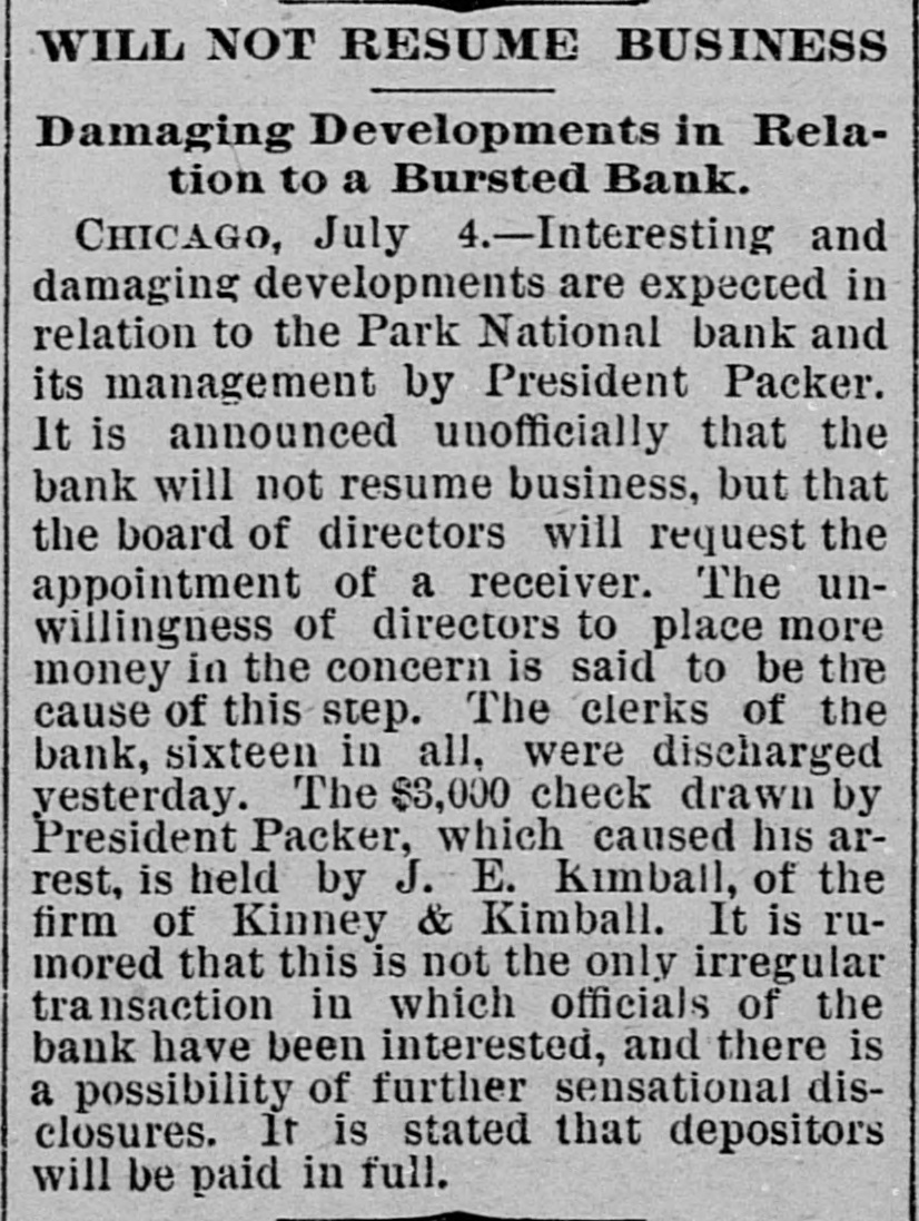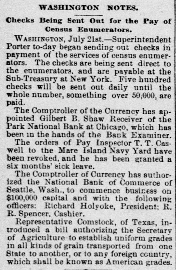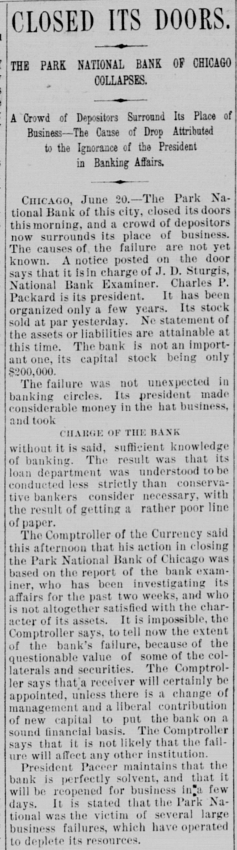THE WEST. THE Cincinnati oak leather tannery was destroyed by fire caused by lightning the other night. Loss, $80,000. W. C. ALDERSON has ordered his trades on the board at Chicago closed. During absence a dishonest clerk plunged in his name to the extent of 250,000 bushels of wheat, it is said, and when the market went against him left the country. Two Chinamen have been arrested near Laro, Ariz., trying to steal across the line. THE whisky trust and the liquor dealers' protective convention, are, it is reported from Peoria, Ill., to be united, with headquarters in Peoria. JOSEPH WELSH, who shot and killed John A. McNeal, in Kingfisher, Ok., May 29, escaped from the military guard house. THE new million dollar building of the San Francisco Chronicle was opened the other night. It is 135 feet high, and has a tower sixty-seven feet above it. The frame work is steel. THE Ohio Supreme Court having refused a new trial to Otto Leuth, the boy murderer, Governor Campbell has respited him to August 20, to allow the board of pardons to review the case. JOHN I. DILLE, land register at Guthrie, Ok., has resigned to engage in the practice of law at Guthrie. THE Republicans of the Sixth Illinois district have renominated Congressman R. R. Hitt. Two hundred striking quarrymen, most of them Swedes from the Lockport quarries at Joliet, Ill., marched to the quarries and forced the men to quit work. They were met by Sheriff Haston and a posse of deputies and ordered to disperse. The refused and the posse attacked them. After a brief skirmish they broke and ran, eight being arrested. CONGRESSMAN JAMES S. OWENS has been renominated by the Democrats of the Fourteenth Ohio district. WHEN Mrs. Margaret Merkle was found guilty of manslaughter at Napa, Cal., in killing Joseph W. Wyle, her husband stated that he had done the killing and not she. THE crucible department of the Detroit (Mich.) steel and spring works was destroyed by fire the other day causing $50,000 loss. AARON M. JONES, a well known pioneer of Colorado, aged sixty, killed his wife and himself aftera quarrel at the breakfast table at his residence in Denver. INTENSE excitement prevailed in Minneapolis, Minn., over the arrest of seven census enumerators on a charge of fraudulent practices in taking the census. The arrests were made on complaint of a resident of St. Paul. JUDGE KAVANAGH, of Des Moines, Iowa, has rendered a decision in the original package case of Terry Chambers. The judge sustains the lower court in condemning the liquors, the evidence tending to show that Chambers had broken the original packages and was selling in quantities to suit purchasers. IN Potter County, S. D., eight persons were drowned in a cloudburst which flooded a large section of country. VICE-PRESIDENT BRYAN,Of the Worlds' Fair Company, in an interview admitted that the directors are negotiating with the Illinois Central railway for the use of the lake front as a site for the Fair. Two men were drowned by the capsizing of a boat near Santa Cruz, Cal. The third was rescued just in time. ROBERT A. WARD, champion amateur half mile runner of the United States, died suddenly at Hillsdale, Mich. THE Park National Bank, of Chicago, has suspended. AN awful tornado visited Illinois on the afternoon of the 20th. In the vicinity of Earlville twenty-five lives were lost. Four were killed at the village of Sublette, south of Dixon. At Cornell much damage was done and four persons were fatally injured. JOSIAH POTTS and Elizabeth Potts, man and wife, were both hanged together at Elko, Nev., for the murder of Miles Fawcett in January, 1888. Both died protesting their innocence. THE Chicago News asserts that the census of that city shows a population of 1,250,000. CORCORAN and McAfee. charged with