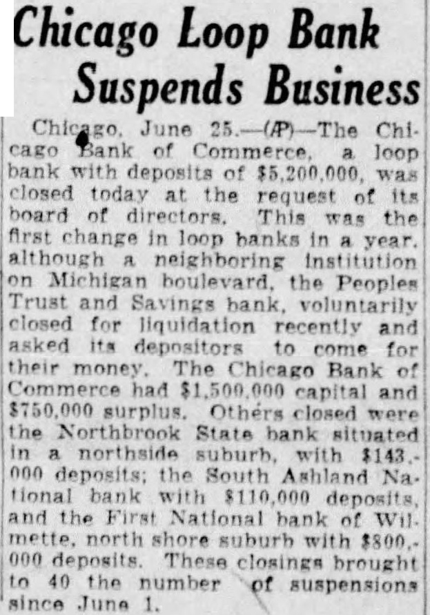 FOUR CHICAGO BANKS, LARGE, CLOSED June loop with deposits of was closed today by State Auditor Oscar Nelson request its board directors This the change Loop banks although neigh boring Michigan vard. the Peoples Trust and Savings closed for liquidaasked its to for their money The Chicago Bank of Commerce had capital and $750,000 closed today were the Others Northbrook Bank situated with the South Ashland Na deposits with deposits the First National Bank North Shore with