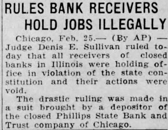 RULES BANK RECEIVERS HOLD JOBS ILLEGALLY Chicago, AP) Judge Denis Sullivan ruled day that all receivers closed banks Illinois holding of their actions The drastic ruling made suit the closed Phillips State Bank and Chicago.