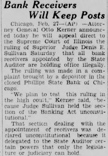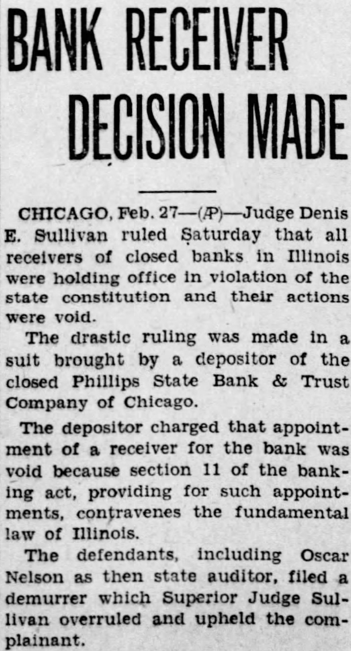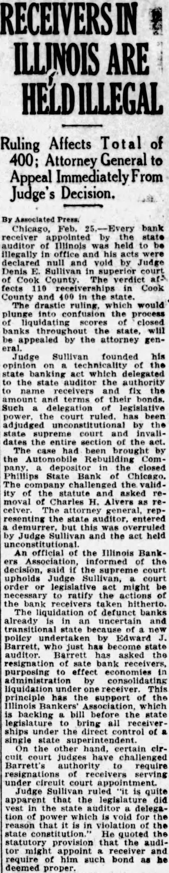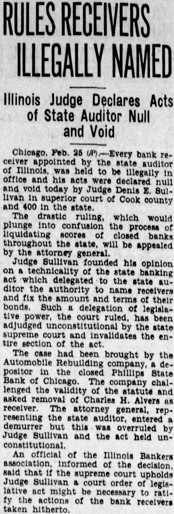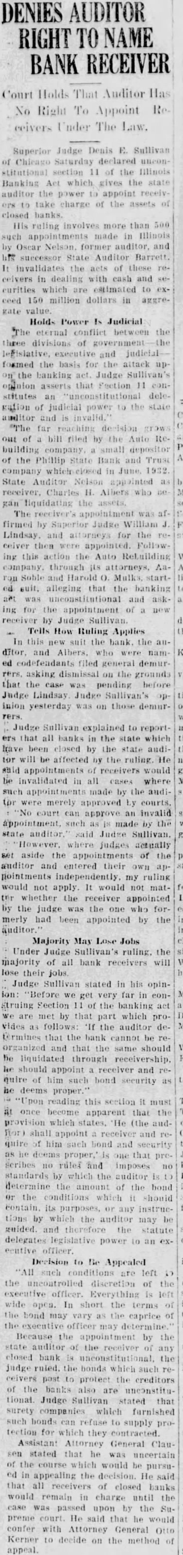 DENIES AUDITOR RIGHT TO NAME BANK RECEIVER Court Holds That Auditor Has No Right To Appoint Receivers Under The Law. Superior Judge Denis E. Sullivan of Chicago Saturday declared unconstitutional section 11 of the Illinois Banking Act which gives the state auditor the power to appoint receivors to take charge of the assets of closed banks. His ruling involves more than 500 such appointments made in Illinois by Oscar Nelson. former auditor, and his successor State Auditor Barrett. It invalidates the acts of these receivers in dealing with cash and securities which are estimated to exceed 150 million dollars in aggregate Holds Power Is Judicial The eternal conflict between the three divisions of government legislative, executive and judicialformed the basis for the attack upthe banking act. Judge Sullivan's opinion asserts that Fection 11 constitutes an "unconstitutional delegation of judicial power to the state auditor and is invalid. "The far reaching decision grows out of a bill filed by the Auto Rebuilding company, a small depositor of the Phillip State Bank and Trust company which closed in June, 1932. State Auditor Nelson appointed as receiver. Charles H. Albers who be gan liquidating the assets. The receiver's appointment was affirmed by Superior Judge William J. Lindsay and attorneys for the receiver then appointed. Following this action the Auto Rebuilding company. through its attorneys, Aaron Soble and Harold O. Mulks. started suit, alleging that the banking act was unconstitutional and asking for the appointment of a new receiver by Judge Sullivan Tells How Ruling Applies In this new suit the bank. the auditor. and Albers, who were named codefendants filed general demurrers. asking dismissal on the grounds that the case was pending before Judge Lindsay Judge Sullivan's ppinion yesterday was on those demurJudge Sullivan explained to reporters that all banks in the state which have been closed by the state audifor will be affected by the ruling. He shid appointments of receivers would be invalidated in all cases where such appointments made by the auditor were merely approved by courts. "No court can approve an invalid appointment, such as made by the state auditor." said Judge Sullivan. "However, where judges actually set aside the appointments of the auditor and entered their own appointments independently, my ruling would not apply. It would not matter whether the receiver appointed by the judge was the one who formerly had been appointed by the Majority May Lose Jobs Under Judge Sullivan's ruling, the majority of all bank receivers will lose their jobs. Judge Sullivan stated in his opinion: "Before we get very far in construing Section 11 of the banking act we are met by that part which provides as follows: 'If the auditor determines that the bank cannot be reorganized and that the same should be liquidated through receivership. he should appoint a receiver and require of him such bond security as he deems proper. "Upon reading this section it must at once become apparent that the provision which states, He (the andftor) shall appoint a receiver and require of him such bond and security as he deems proper,' is one that preseribes no rules and imposes no standards by which the auditor is to determine the amount of the bond or the conditions which it should contain. its purposes, or any instruetions by which the auditor may be guided. and therefore the statute delegates legislative power to an exofficer. Decision to Be Appealed "All such conditions are left i) the uncontrolled discretion of the executive officer. Everything is left wide open. In short the terms of the bond may vary as the caprice of the executive officer may determine. Because the appointment by the state auditor of the receiver of any closed bank is unconstitutional, the judge ruled. the bonds which such receivers post to protect the creditors of the banks also are unconstitutional. Judge Sullivan stated that surety companies which furnished such bonds can refuse to supply protection for which they contracted. Assistant Attorney General Clausen stated that he was uncertain of the course which would be pursued in appealing the decision. He said that all receivers of closed banks would remain in charge until the case was passed upon by the Supreme court. He said that he would confer with Attorney General Otto Kerner to decide on the method of appeal.