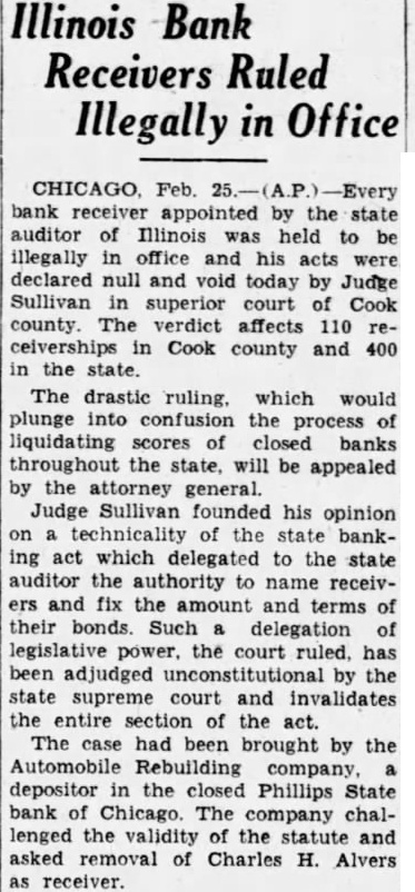 Illinois Bank Receivers Ruled Illegally in Office Feb. bank receiver appointed the state auditor of Illinois held illegally office and his declared null and void today by Judge Sullivan superior court of Cook verdict affects 110 ceiverships Cook county and 400 the state. The drastic ruling. which would plunge into the liquidating scores of closed banks throughout the state, will be appealed by the attorney general. Judge Sullivan founded his opinion of the state banking act which delegated to the state auditor the authority to name receivers and fix the amount and terms of their bonds Such delegation legislative power, the court ruled, has been adjudged unconstitutional by the state supreme court and invalidates the entire section of the act. The had been brought by the Automobile Rebuilding company depositor the closed Phillips State bank Chicago. The company challenged the validity the statute and asked removal of Charles H. Alvers