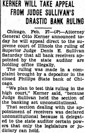 WILL TAKE APPEAL FROM JUDGE SULLIVAN'S DRASTIC BANK RULING General Otto announced day he will appeal direct to the preme court Illinois the ruling Superior Judge Denis Sullivan Saturday that bank receivers pointed by the state auditor are holding office illegally. The ruling made in complaint brought depositor in closed Phillips State bank of Chicago. plan to test this ruling in the high Kerner said, "because Judge Sullivan held the section the banking unconstitutional. That section dealing with the pointment of receivers was declared unconstitutional because delegated to the state auditor certain that only the legislature can hold.