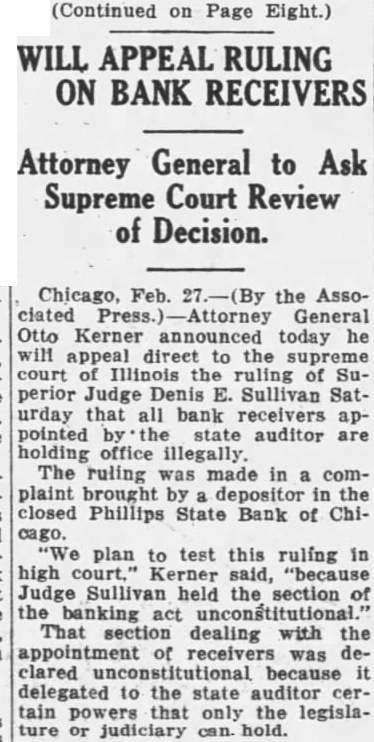 (Continued on Page Eight.) WILL APPEAL RULING ON BANK RECEIVERS Attorney General to Ask Supreme Court Review of Decision. Chicago, Feb. the Assoclated General Otto Kerner announced today he appeal direct to the supreme court the ruling perior Judge Denis Sullivan Saturday that all bank receivers pointed state auditor holding office illegally. The ruling made in complaint brought by the closed Phillips State Bank of Chiplan test this ruling high said, Judge Sullivan held section the That section dealing with the appointment of receivers was clared because delegated the state auditor that only legislajudiciary hold.