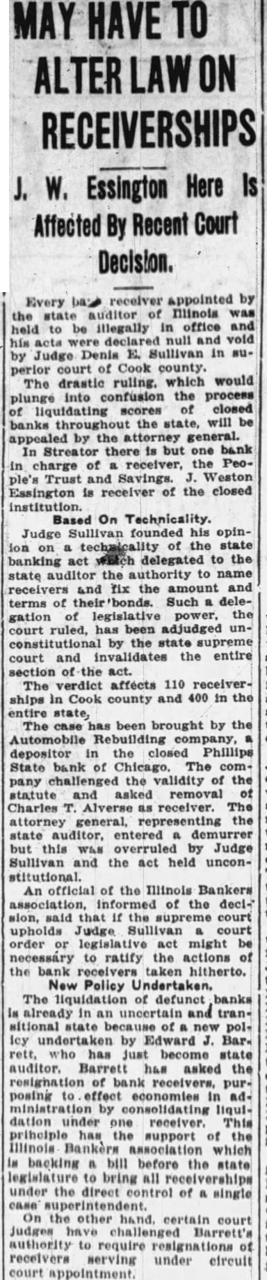 MAY HAVE TO RECEIVERSHIPS Here Essington Recent receiver appointed by Every the state auditor of Illinois illegally in office and held be null and void acts Denis Sullivan in by Judge perior court of Cook county. which would The drastic into confusion the process plunge scores closed liquidating the state, will banks throughout appealed by the attorney general. Streator there is but one bank In charge of receiver, the People's Trust and Savings. Weston Essington receiver of the closed institution. Based On Technicality. Judge Sullivan founded his opinof the state banking act delegated to the state auditor the authority to name receivers and fix the amount and terms of Such delelegislative power, the gation court ruled, has been adjudged unconstitutional by the state supreme court and invalidates the entire section of the act. The verdict affects 110 receiverships In Cook county and 400 in the entire state, The has been brought by the Automobile depositor in the closed Phillips State bank of Chicago. The company challenged the validity of the statute and asked removal of Charles T. Alverse receiver. The attorney general, representing the state auditor, entered demurrer but this was overruled by Judge Sullivan and the act held unconstitutional. An official of the Illinois Bankers of the decision, said that if the court upholds Judge Sullivan court order or act might be necessáry to ratify the actions of the bank receivers taken hitherto. New Policy Undertaken. The liquidation of defunct banks already in an uncertain and transitional state because of polIcy undertaken by Edward Bar. rett, who has just become state auditor. Barrett has asked the resignation of bank purposing to effect economies adby liquidation under one receiver. This principle has the support of the Illinois Bankers association which backing bill before the state legislature to bring all receiverships under the direct control of single superintendent. On other hand. certain court Judges challenged Barrett's authority require resignations of receivers serving under circuit court appointment.